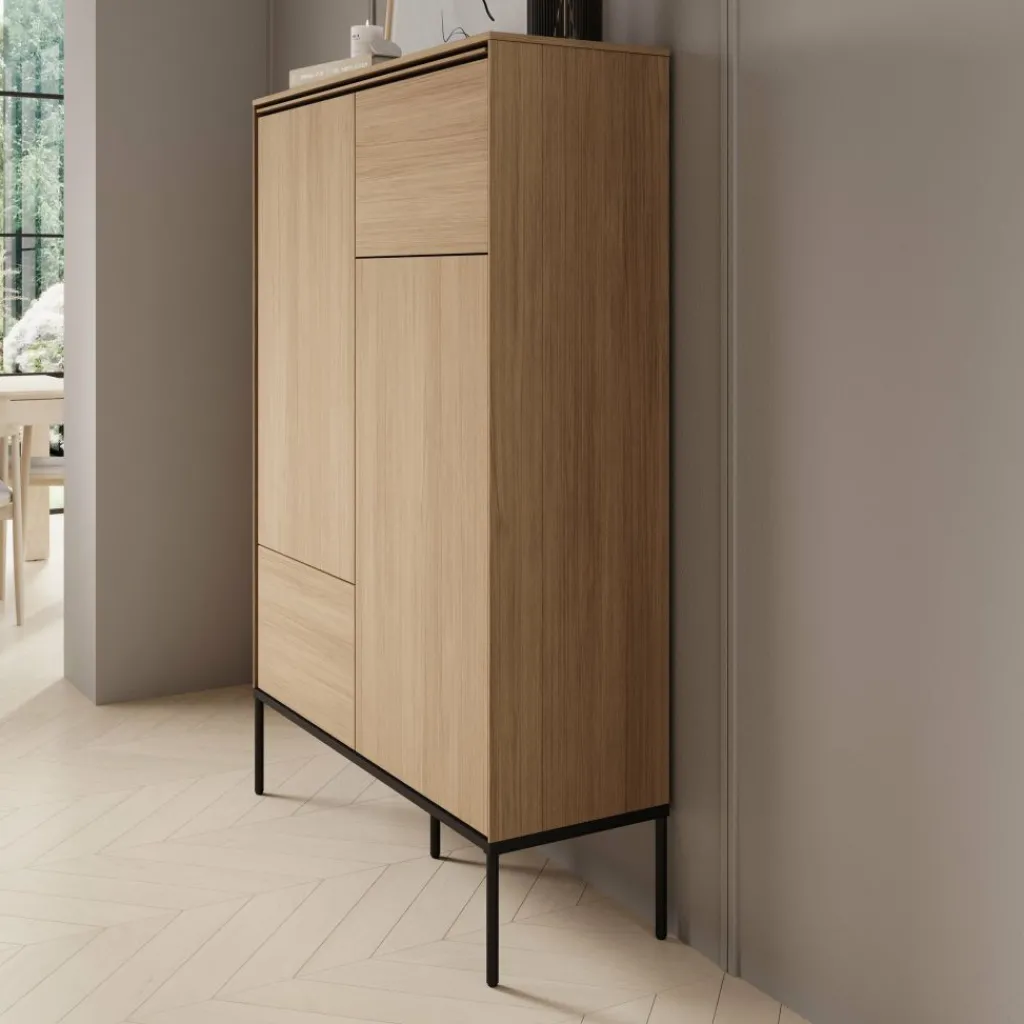 De Vicious kast in eikenhoutlook combineert een warme, natuurlijke uitstraling met een moderne en minimalistische vormgeving. De hoge, slanke proporties zorgen voor een elegante aanblik, terwijl de zwarte metalen poten en details een eigentijdse touch toevoegen.
