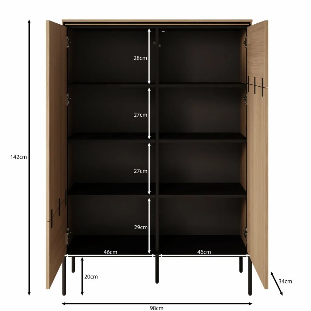 Achter de vier deuren bevindt zich een royale opbergruimte met meerdere legplanken, ideaal voor het netjes opbergen van servies, boeken of andere accessoires. Dankzij het strakke ontwerp en de hoogwaardige afwerking past deze kast moeiteloos in diverse interieurs, van modern tot Scandinavisch.