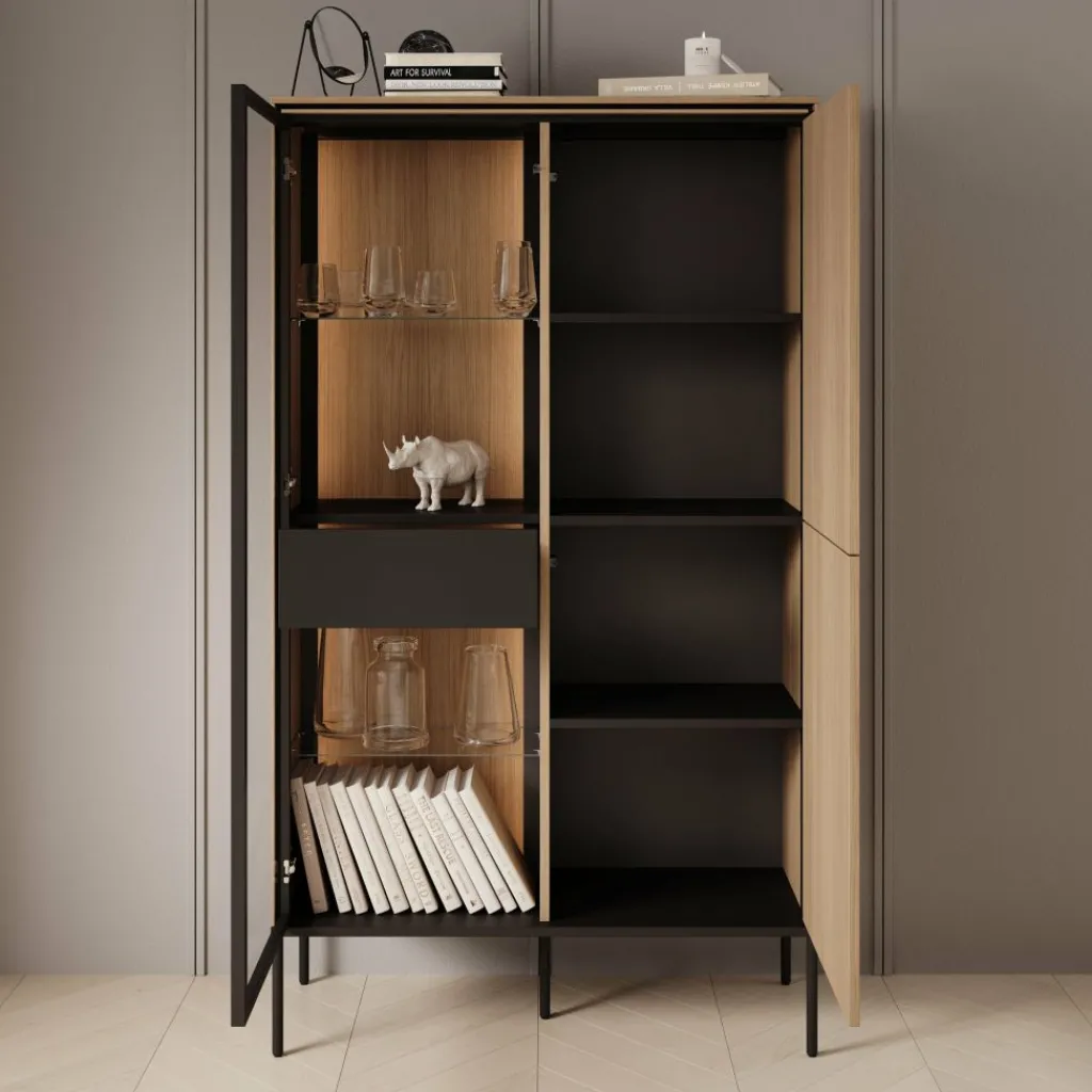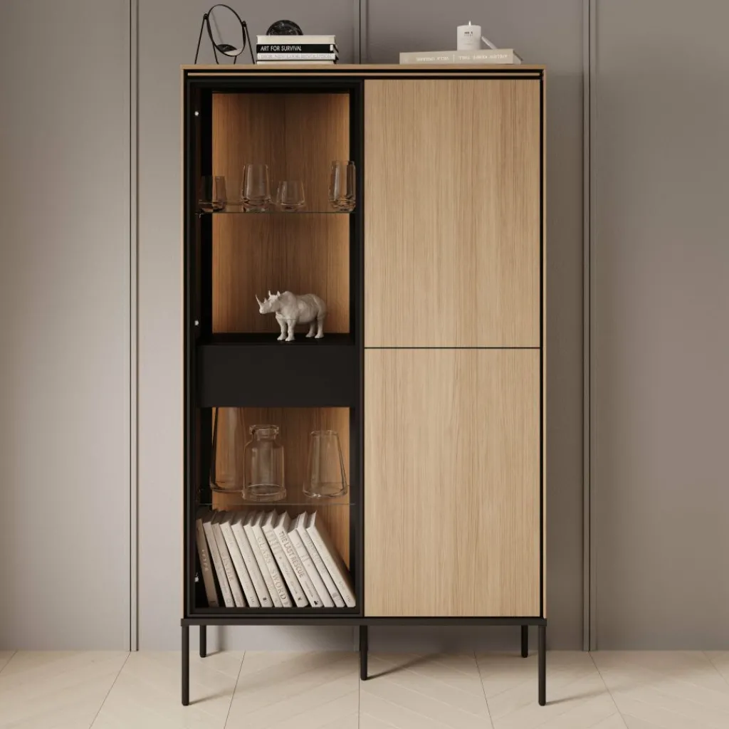 De Vicious vitrinekast in eikenlook combineert stijl en functionaliteit in een eigentijds ontwerp. De kast heeft een warme houtkleur met zwarte accenten en rust op slanke metalen poten voor een luchtige uitstraling. Dankzij de glazen deur met LED-verlichting kun je decoratieve items of servies elegant presenteren, terwijl de gesloten opbergvakken ruimte bieden voor spullen die je liever uit het zicht houdt. De combinatie van glas, hout en metaal zorgt voor een moderne, maar tijdloze uitstraling die perfect past in een Scandinavisch of industrieel interieur.