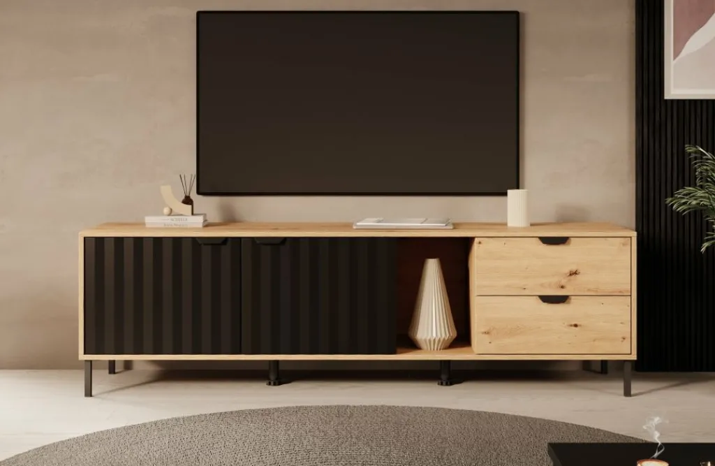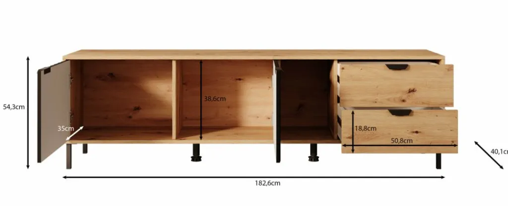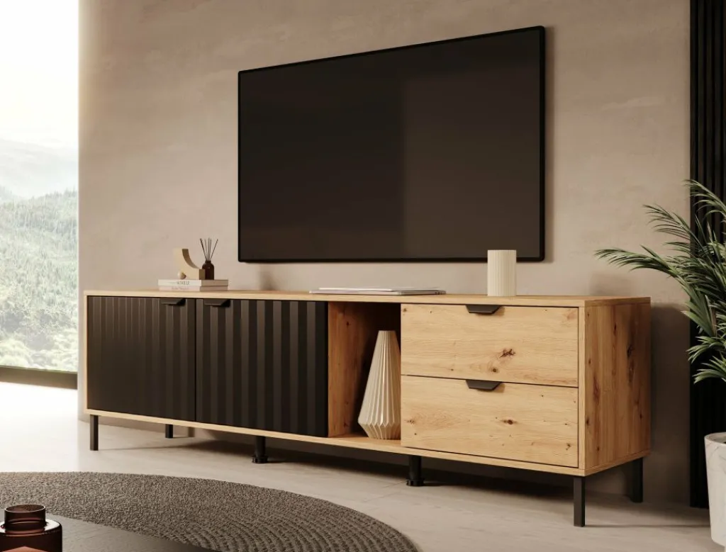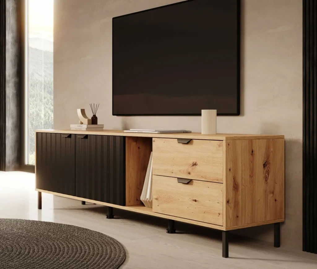 TV-Meubel Vic is een opbergkast voor onder de tv in een moderne stijl. De TV kast beschikt over 1 open vak, 2 deuren en 2 lades die openen met zwart metalen handgrepen. Het meubel is uitgevoerd in een zwart met eiken kleur. Het meubel staat op metalen poten en er zit geen uitsparing in de achterwand.