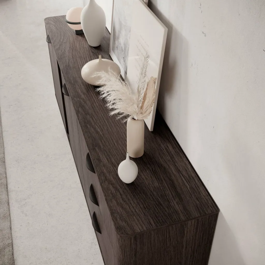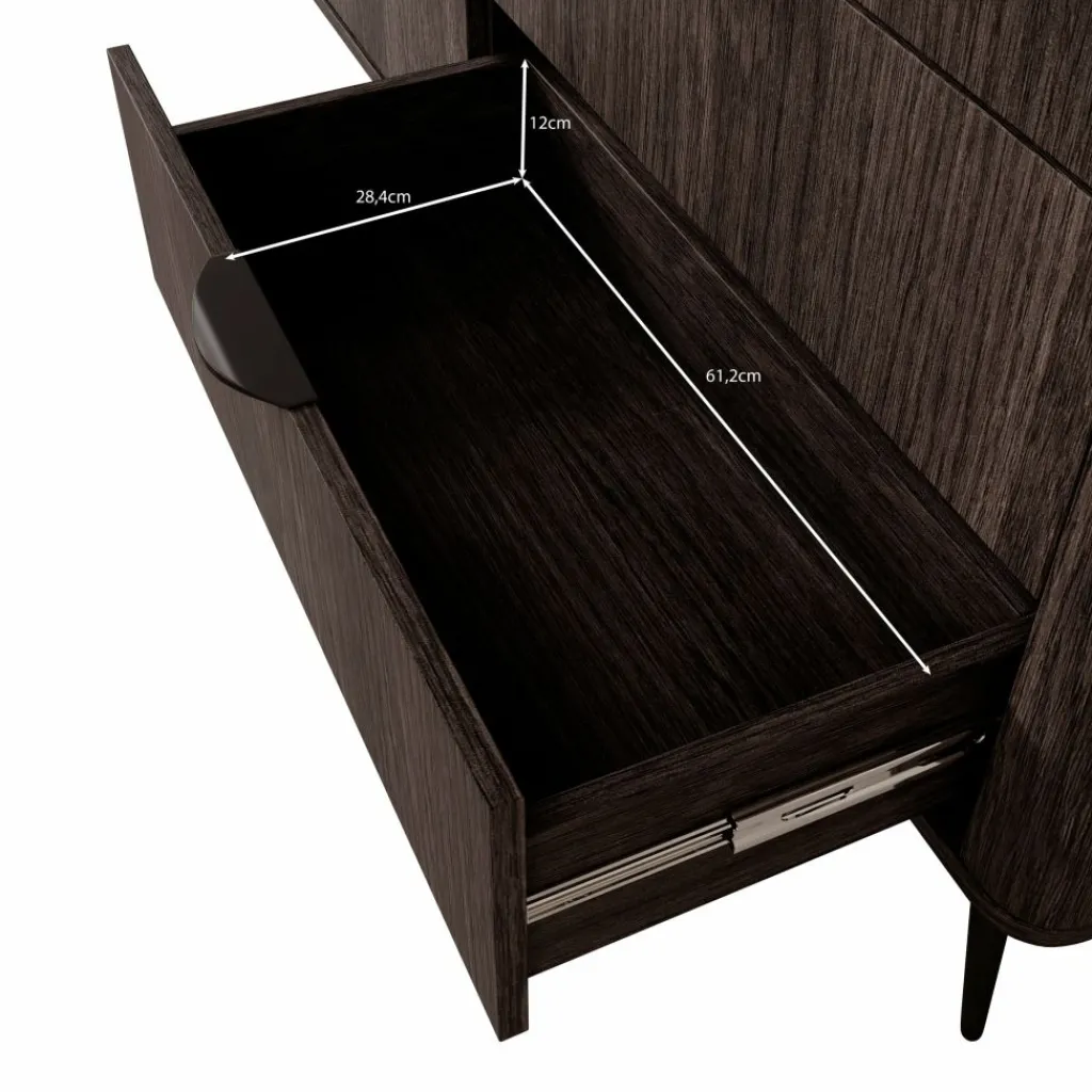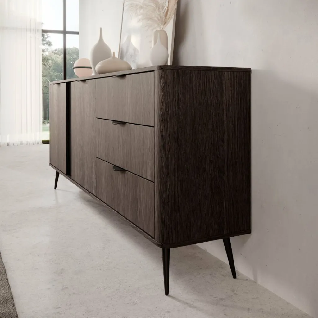 Het Victoria dressoir in donker eiken heeft een modern ontwerp met een warme, stijlvolle uitstraling. De donkere houtstructuur, afgeronde hoeken en slanke poten zorgen voor een elegant geheel dat zowel strak als sfeervol oogt.