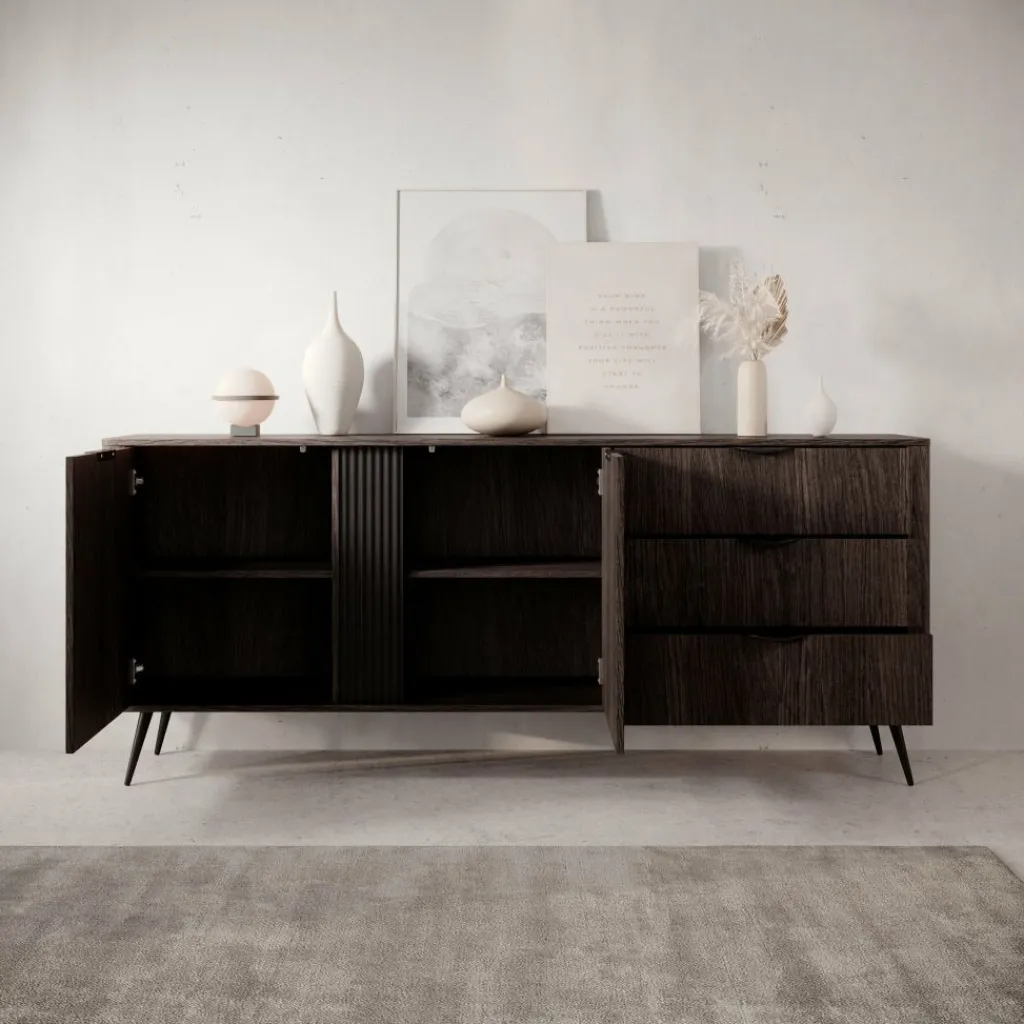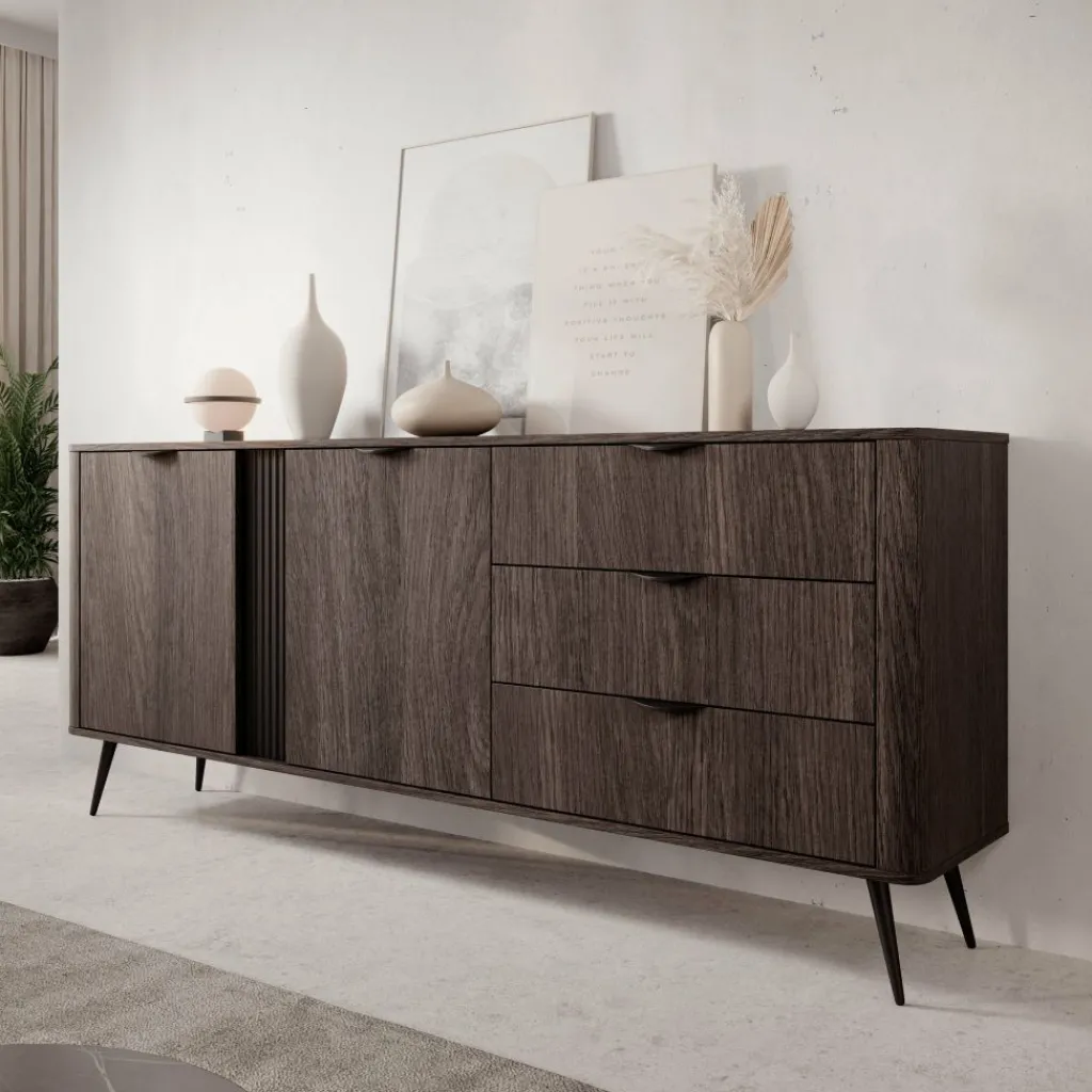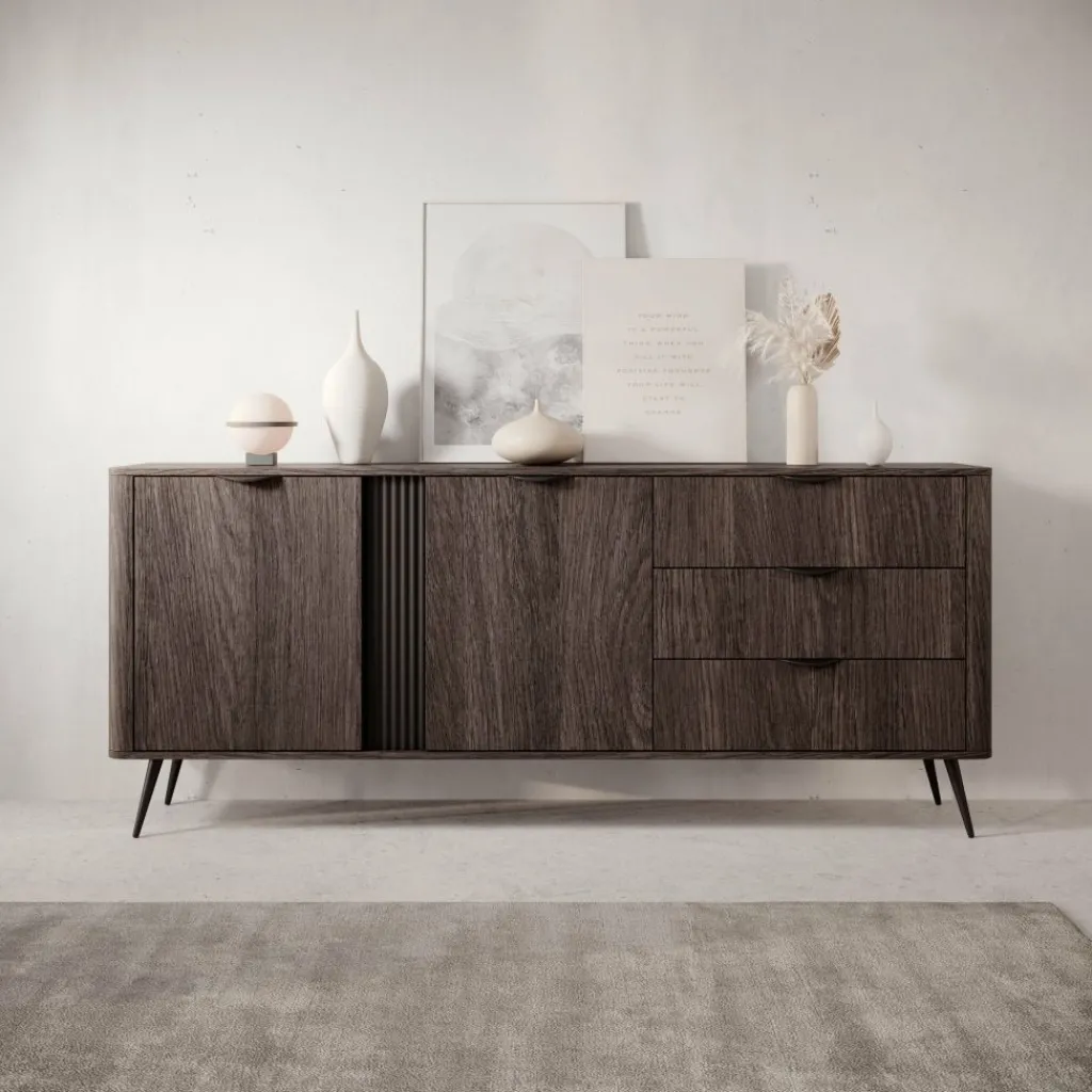 Het Victoria dressoir in donker eiken heeft een modern ontwerp met een warme, stijlvolle uitstraling. De donkere houtstructuur, afgeronde hoeken en slanke poten zorgen voor een elegant geheel dat zowel strak als sfeervol oogt.