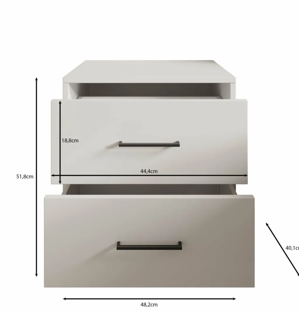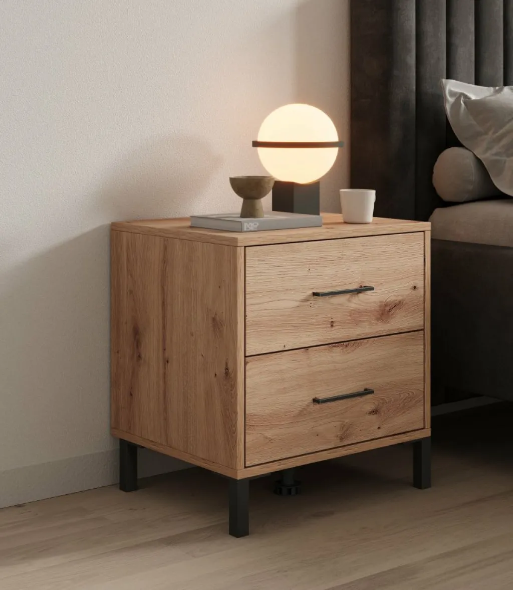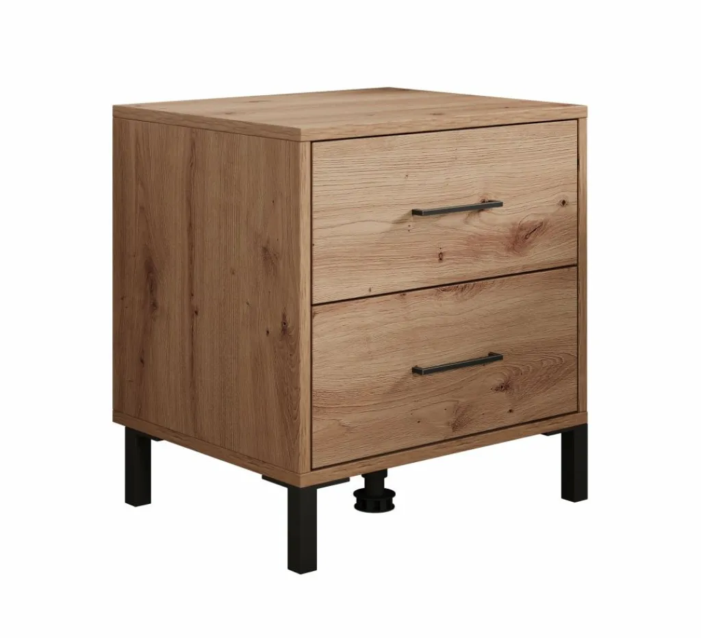 Nachtkastje Vidor is een opbergkastje voor naast het bed in een moderne stijl. Het nachtkastje is uitgevoerd in een eiken kleur met zwarte poten. De Vidor beschikt over 2 lades die te openen zijn met zwarte handgrepen.
