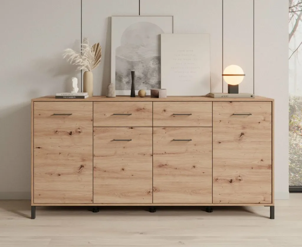 Dressoir Vidor is een opbergkast in moderne stijl. De kast beschikt over 2 lades en 4 deuren die openen met zwarte handgrepen. Achter de deuren zijn in totaal 8 opbergvakken te vinden. Het dressoir is uitgevoerd in een eiken kleur met zwarte poten.