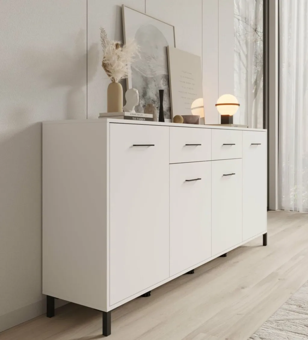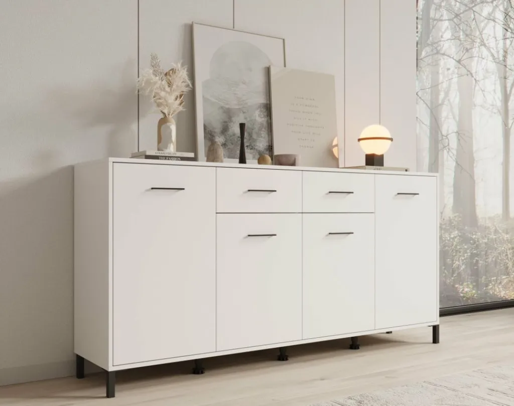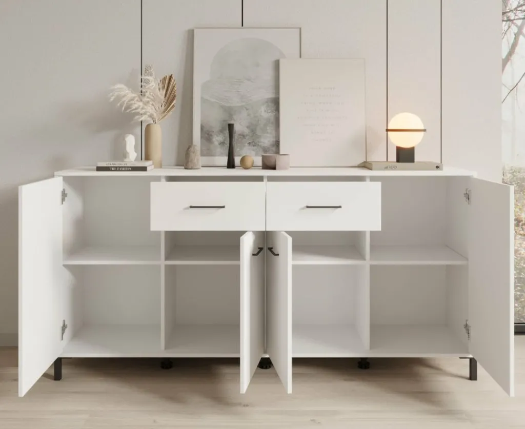 Dressoir Vidor is een opbergkast in moderne stijl. De kast beschikt over 2 lades en 4 deuren die openen met zwarte handgrepen. Achter de deuren zijn in totaal 8 opbergvakken te vinden. Het dressoir is uitgevoerd in een witte kleur met zwarte poten.