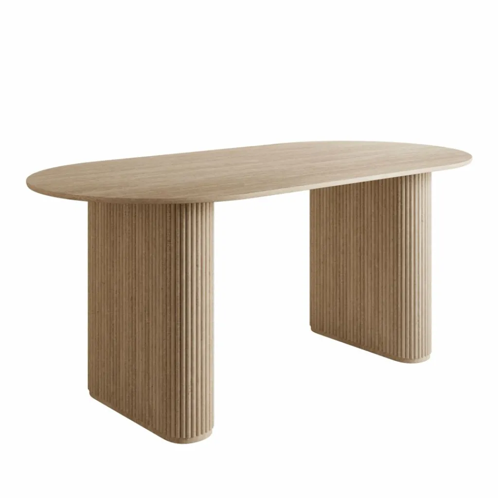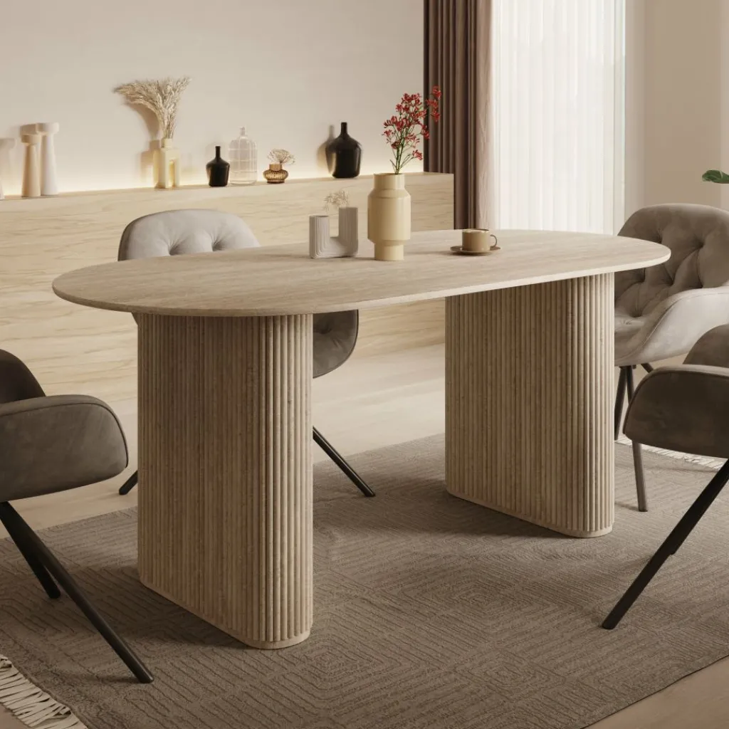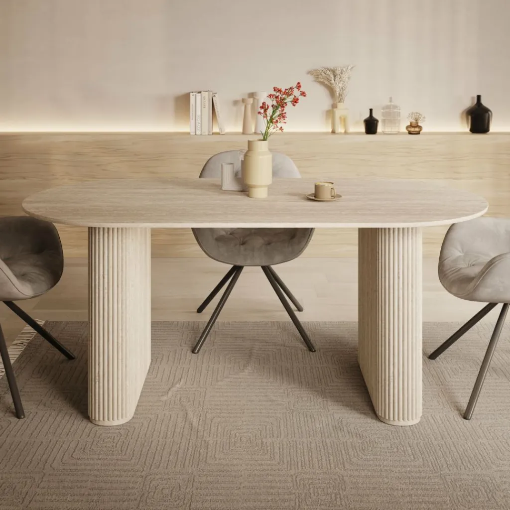 De tafel staat op twee stevige, geribde kolompoten die zorgen voor stabiliteit en een duidelijke, architectonische basis. Door deze poten blijft er rondom voldoende beenruimte beschikbaar en kan de tafel praktisch worden ingedeeld met verschillende stoelen. Het travertinlook blad geeft de tafel een lichte, natuurlijke uitstraling zonder nadruk te leggen op specifieke materiaalsoorten.