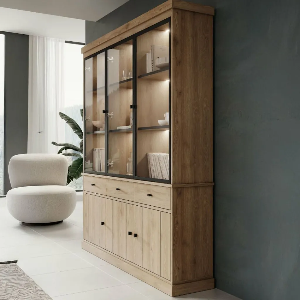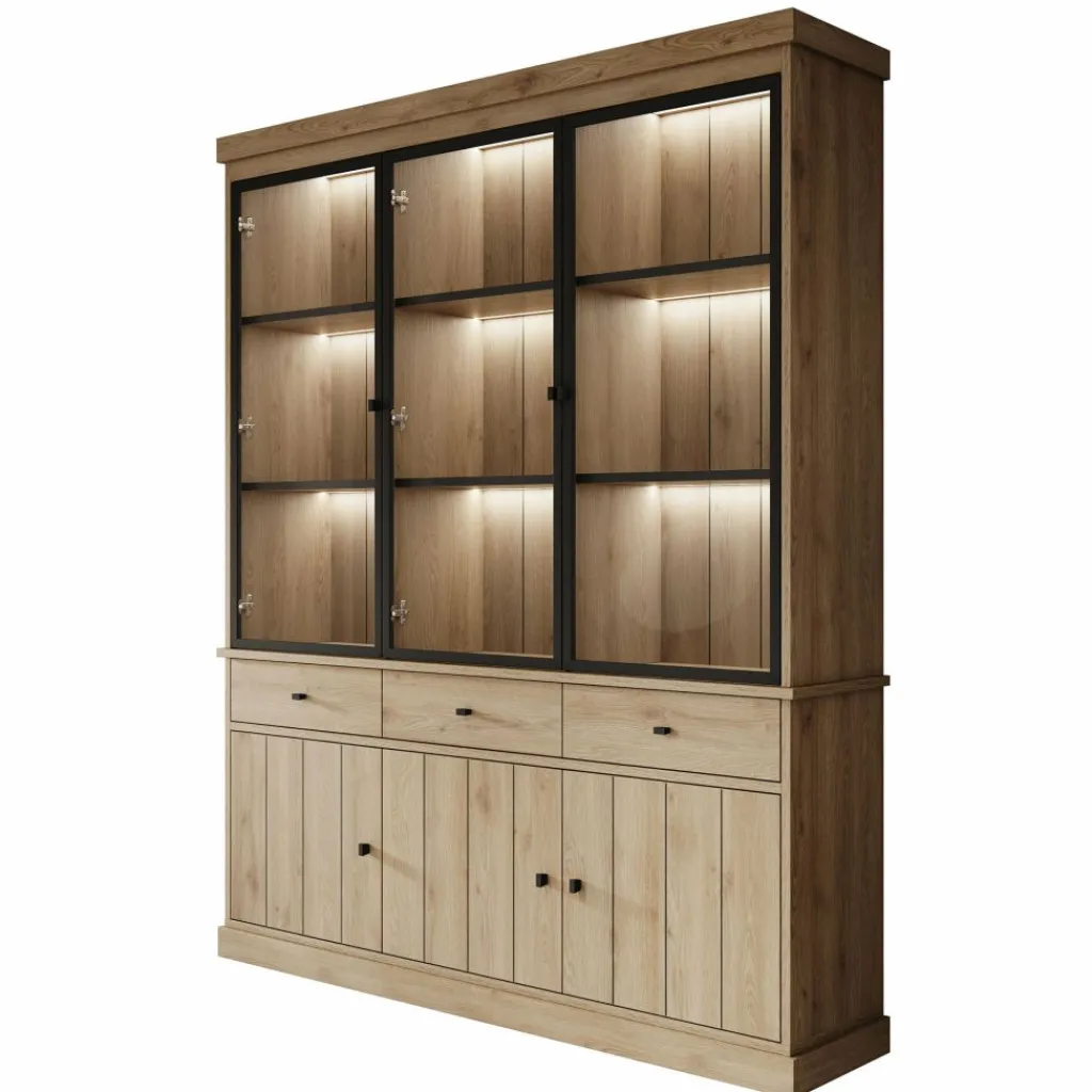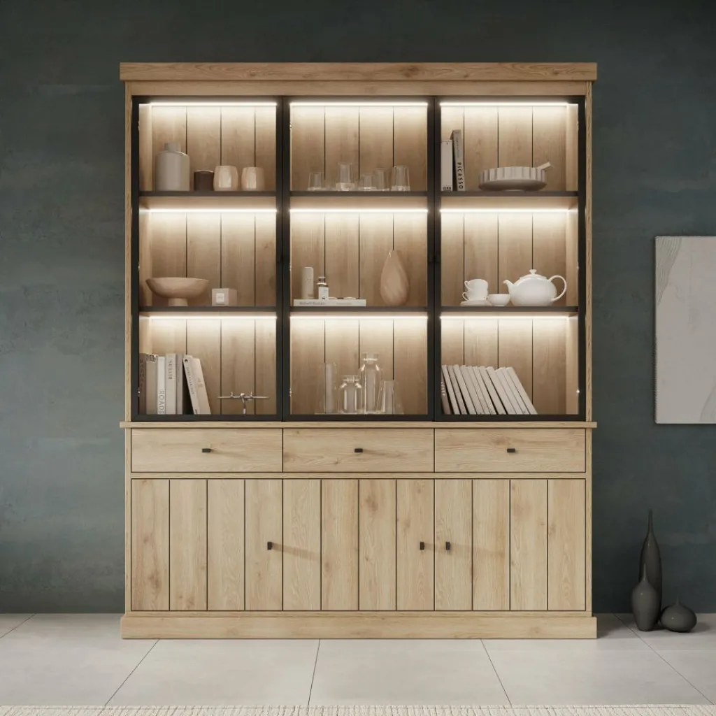 Buffetkast Vince is een praktisch vormgegeven kast in eiken kleur. De kast is gemaakt van melamine gelamineerd spaanplaat en bestaat uit twee delen: een onder- en bovenkast. Het onderste gedeelte beschikt over 3 lades en 3 deuren waarachter zich 6 opbergvakken bevinden. Het bovenste gedeelte is voorzien van 3 glazen deuren met daarachter 9 opbergvakken. Alle lades en deuren openen met zwarte knoppen.