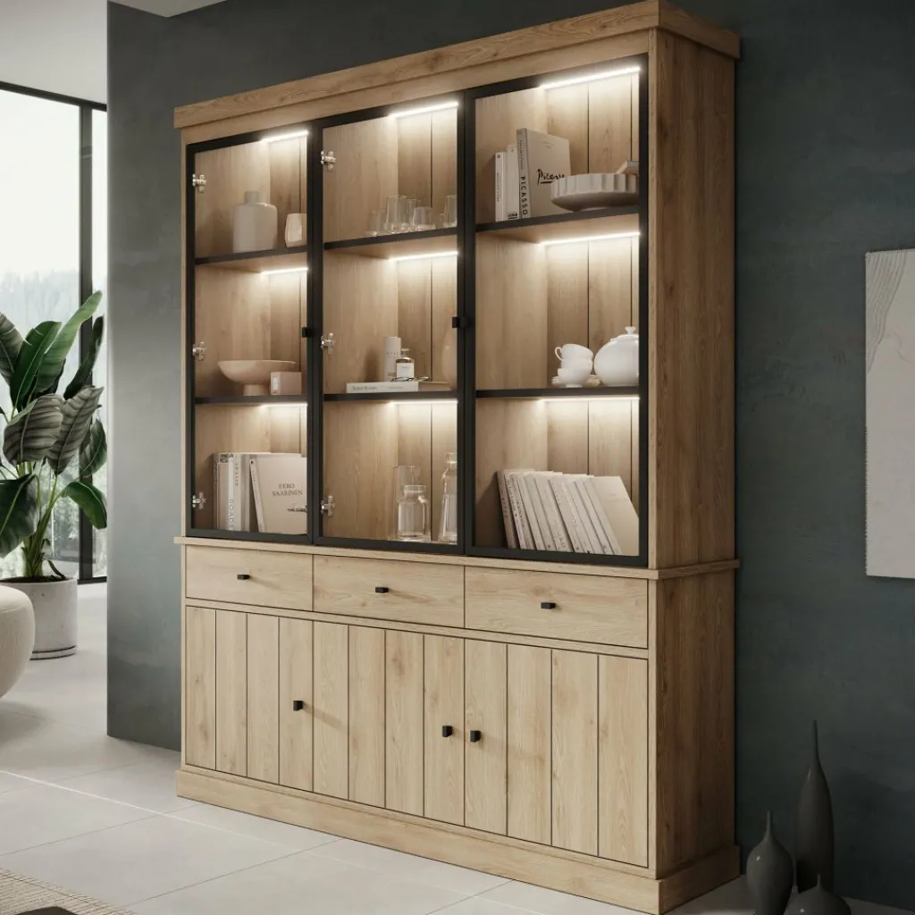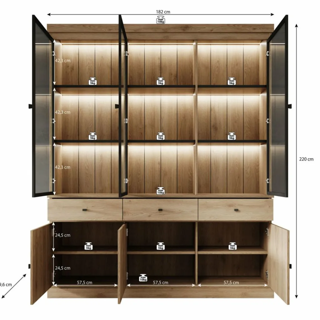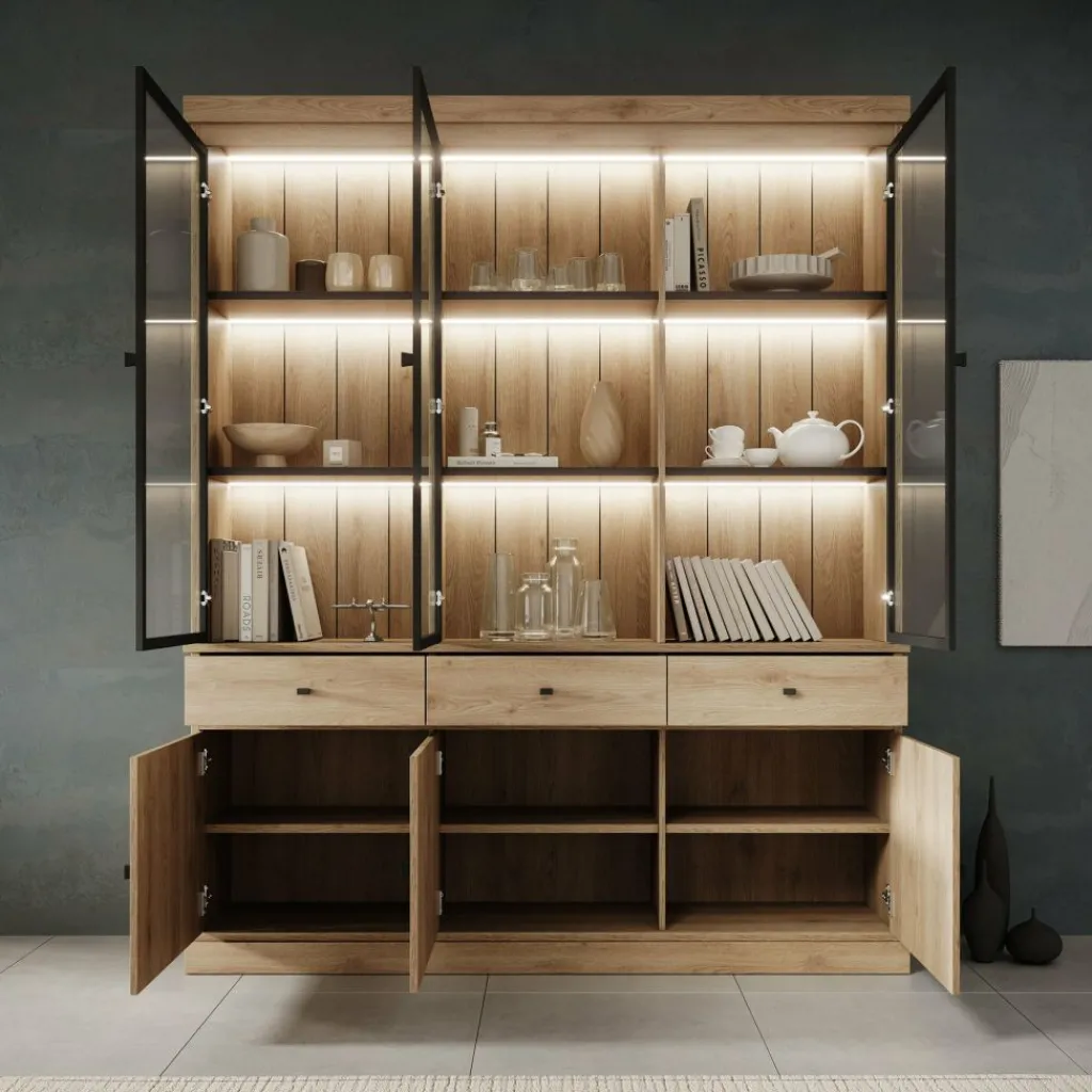 Buffetkast Vince is een praktisch vormgegeven kast in eiken kleur. De kast is gemaakt van melamine gelamineerd spaanplaat en bestaat uit twee delen: een onder- en bovenkast. Het onderste gedeelte beschikt over 3 lades en 3 deuren waarachter zich 6 opbergvakken bevinden. Het bovenste gedeelte is voorzien van 3 glazen deuren met daarachter 9 opbergvakken. Alle lades en deuren openen met zwarte knoppen.