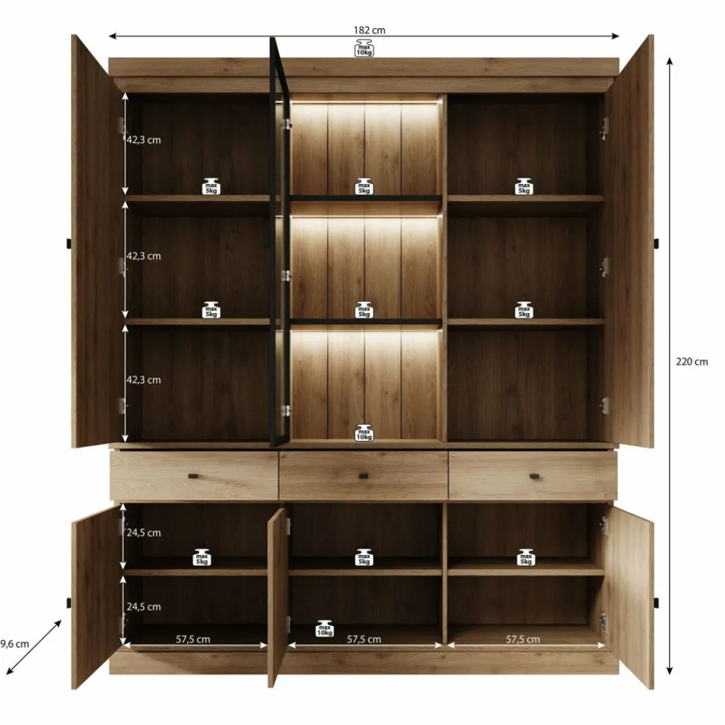 De kast is voorzien van LED-verlichting, wat zorgt voor een opvallend accent in het interieur. De verlichting is eenvoudig in- en uit te schakelen via de meegeleverde voetschakelaar.