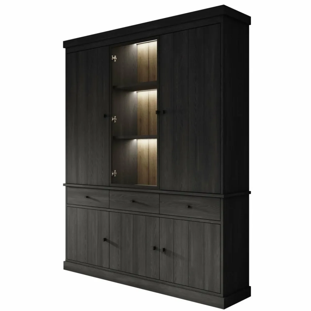 Buffetkast Vince is een praktisch vormgegeven kast in zwart eiken kleur. De kast is gemaakt van melamine gelamineerd spaanplaat en bestaat uit twee delen: een onder- en bovenkast. Het onderste gedeelte beschikt over 3 lades en 3 deuren waarachter zich 6 opbergvakken bevinden. Het bovenste gedeelte heeft 3 deuren, waarvan de middelste is uitgevoerd met glas. Achter deze deuren bevinden zich nog eens 9 opbergvakken. Alle lades en deuren openen met zwarte knoppen.