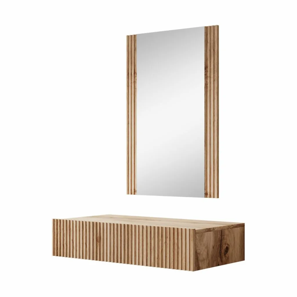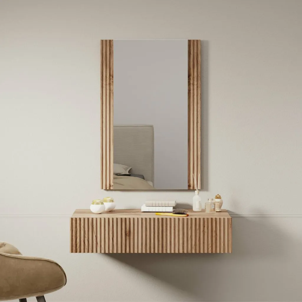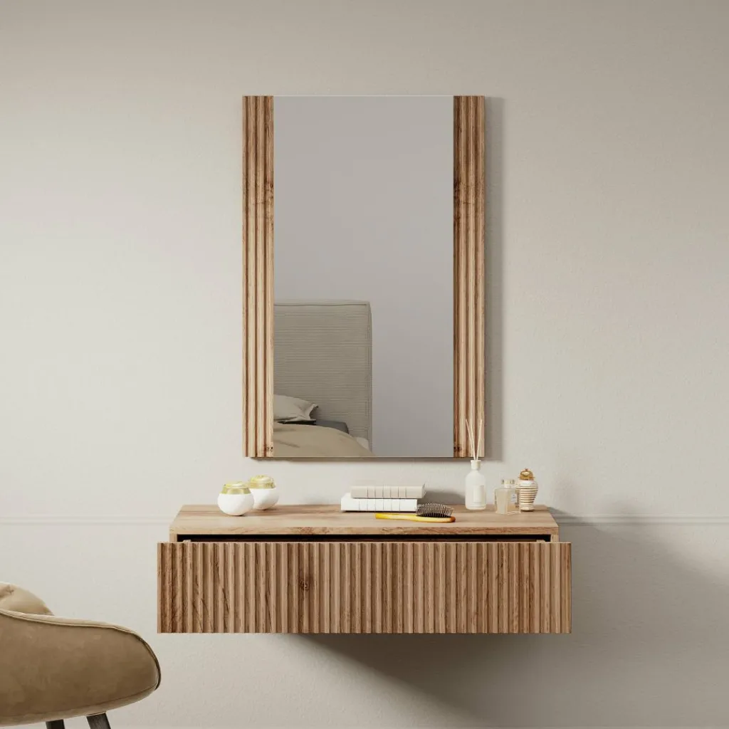Kaptafel Vintar is gemaakt van een stevige spaanplaat constructie met duurzaam FSC keurmerk. De Vintar is uitgevoerd in een eiken kleur. De kaptafel beschikt over een greeploze opberglade. Het blad is 80×42 cm en biedt daardoor genoeg plek voor alle make-up, sieraden en accessoires. Dit model is aan de muur op te hangen en bespaard hierdoor een hoop ruimte in jouw slaapkamer. De make-up tafel wordt met bijpassende spiegel (54×80 cm) geleverd.