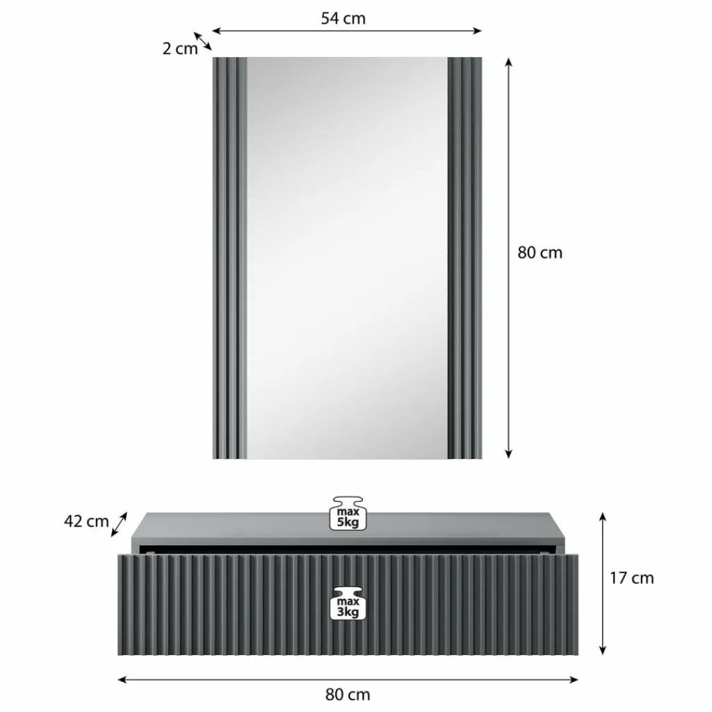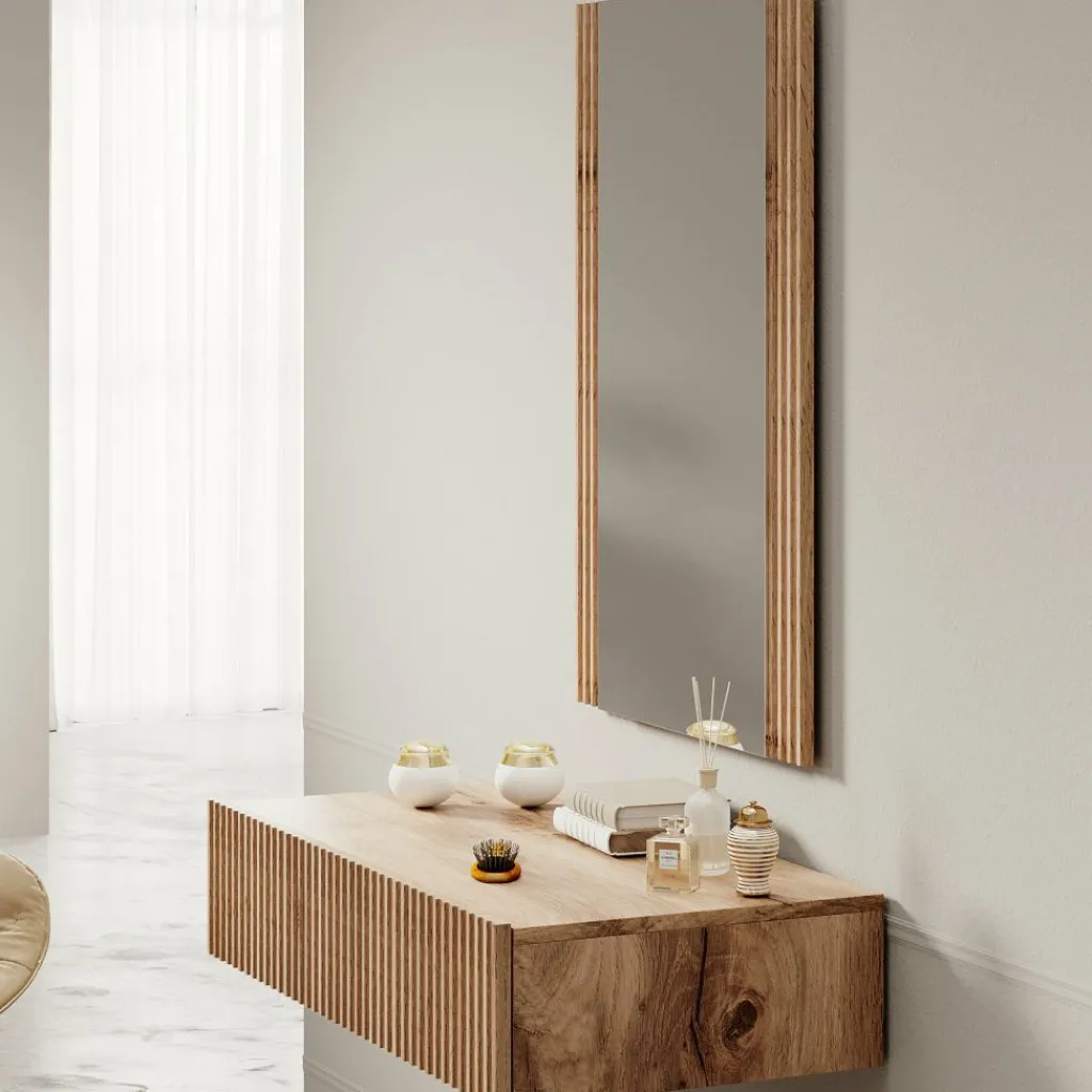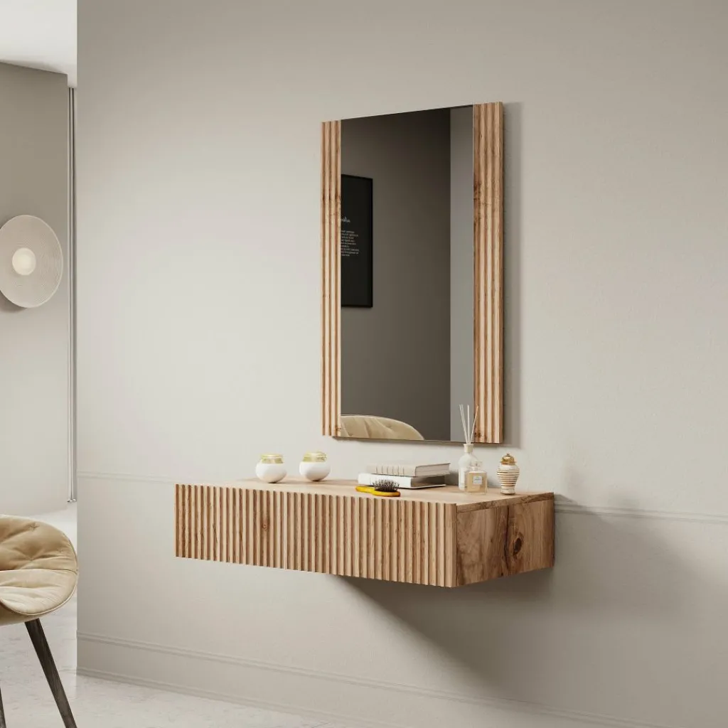 Kaptafel Vintar is gemaakt van een stevige spaanplaat constructie met duurzaam FSC keurmerk. De Vintar is uitgevoerd in een eiken kleur. De kaptafel beschikt over een greeploze opberglade. Het blad is 80×42 cm en biedt daardoor genoeg plek voor alle make-up, sieraden en accessoires. Dit model is aan de muur op te hangen en bespaard hierdoor een hoop ruimte in jouw slaapkamer. De make-up tafel wordt met bijpassende spiegel (54×80 cm) geleverd.