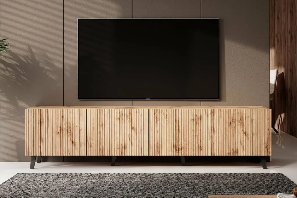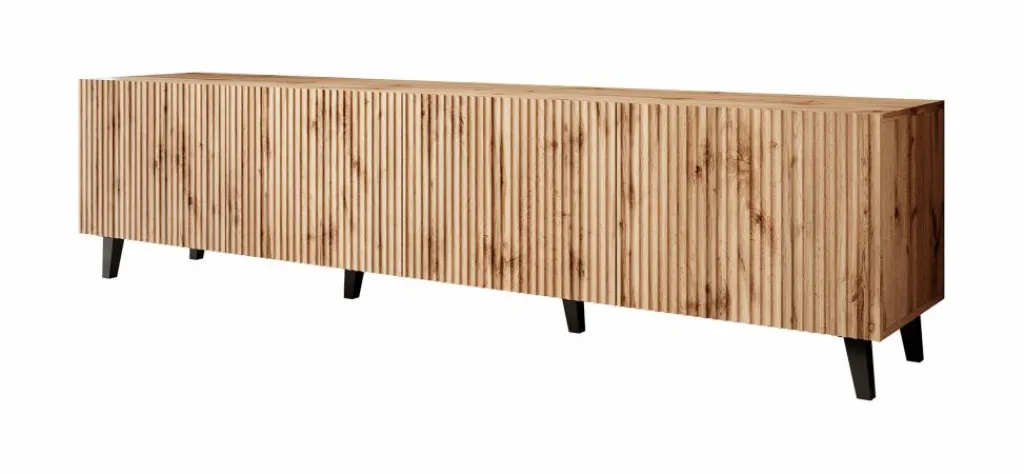 TV-meubel Vintar is een strak meubel uitgevoerd in een eiken kleur. Deze kast heeft een breedte van 201 centimeter en is gemaakt van spaanplaat. De kast beschikt over vier klepdeuren welke te openen zijn via de bovenzijde. De voorzijde van het meubel heeft een lamellen-effect. Het meubel staat op zwarte hoge pootjes. Dankzij het kleur- en materiaalgebruik is dit meubel geschikt voor zowel industriële als hotelchique interieurs.