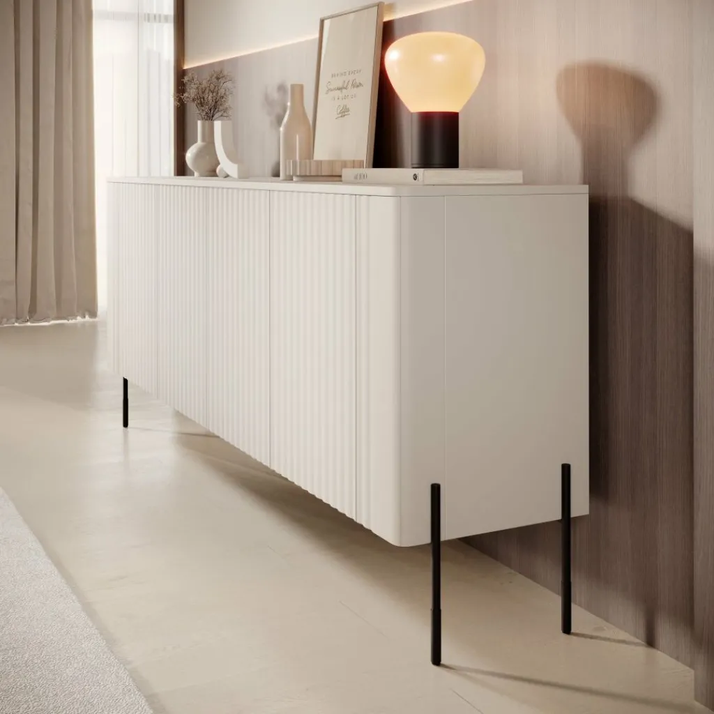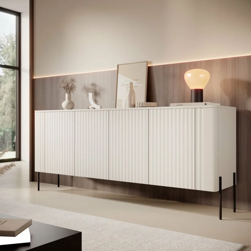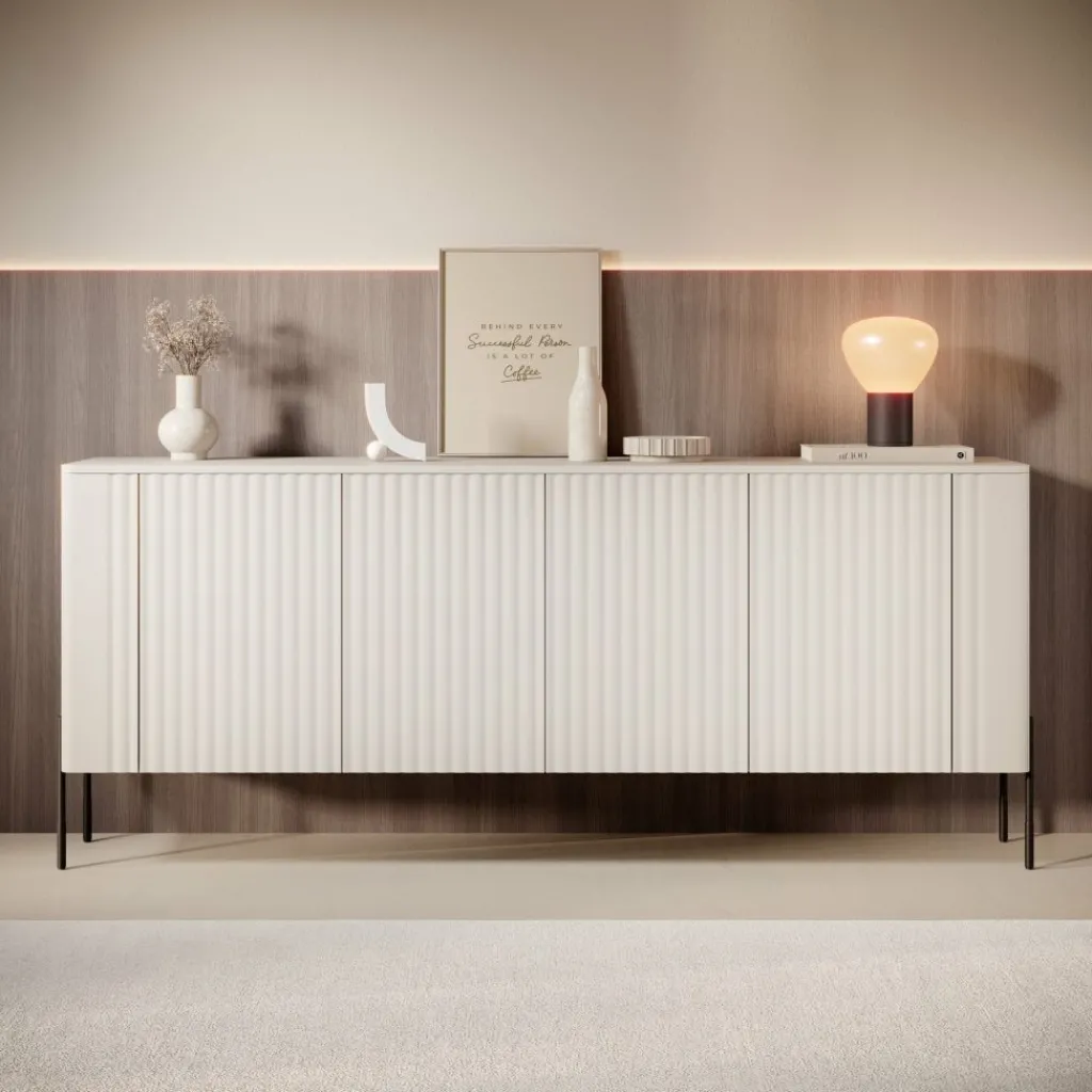 Het Vivi dressoir in beige heeft een breedte van 190 cm, een diepte van 40 cm en een hoogte van 80 cm. De kast is voorzien van verticale lamellen over de gehele voorzijde, wat zorgt voor een verfijnd en rustig lijnenspel. Achter de deuren bevindt zich ruime opbergruimte voor servies, glaswerk of woonaccessoires.