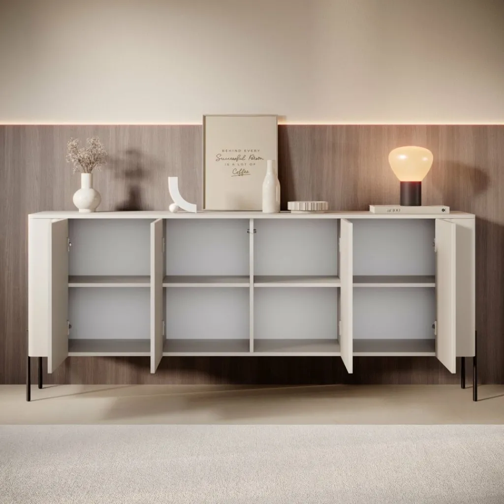 Het meubel staat op hoge, slanke poten van metaal die bijdragen aan een open en uitgebalanceerde uitstraling. De zachte beige kleur geeft warmte aan het interieur en combineert moeiteloos met zowel lichte als donkere tinten. Perfect voor een eigentijdse woonstijl met een subtiel karakter.