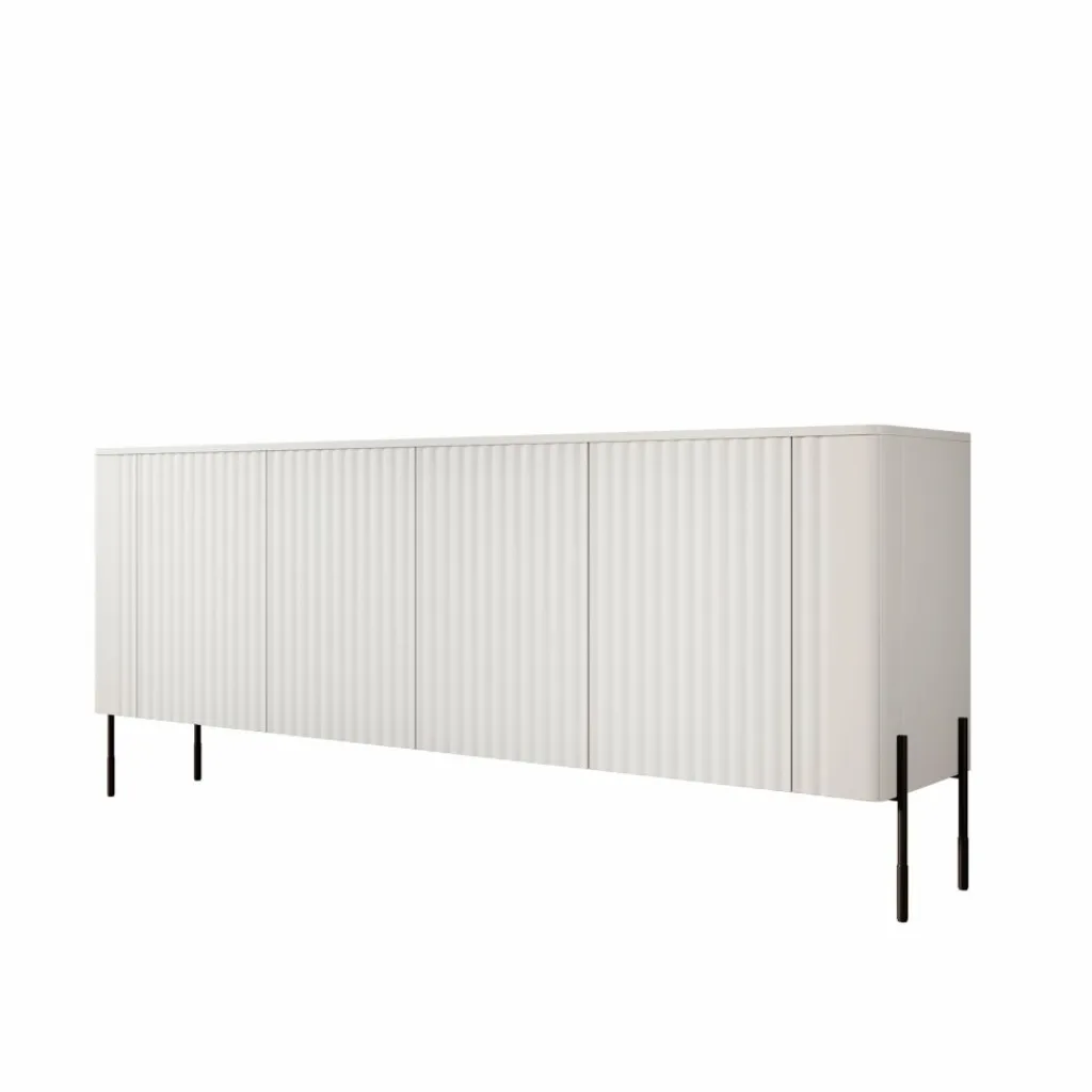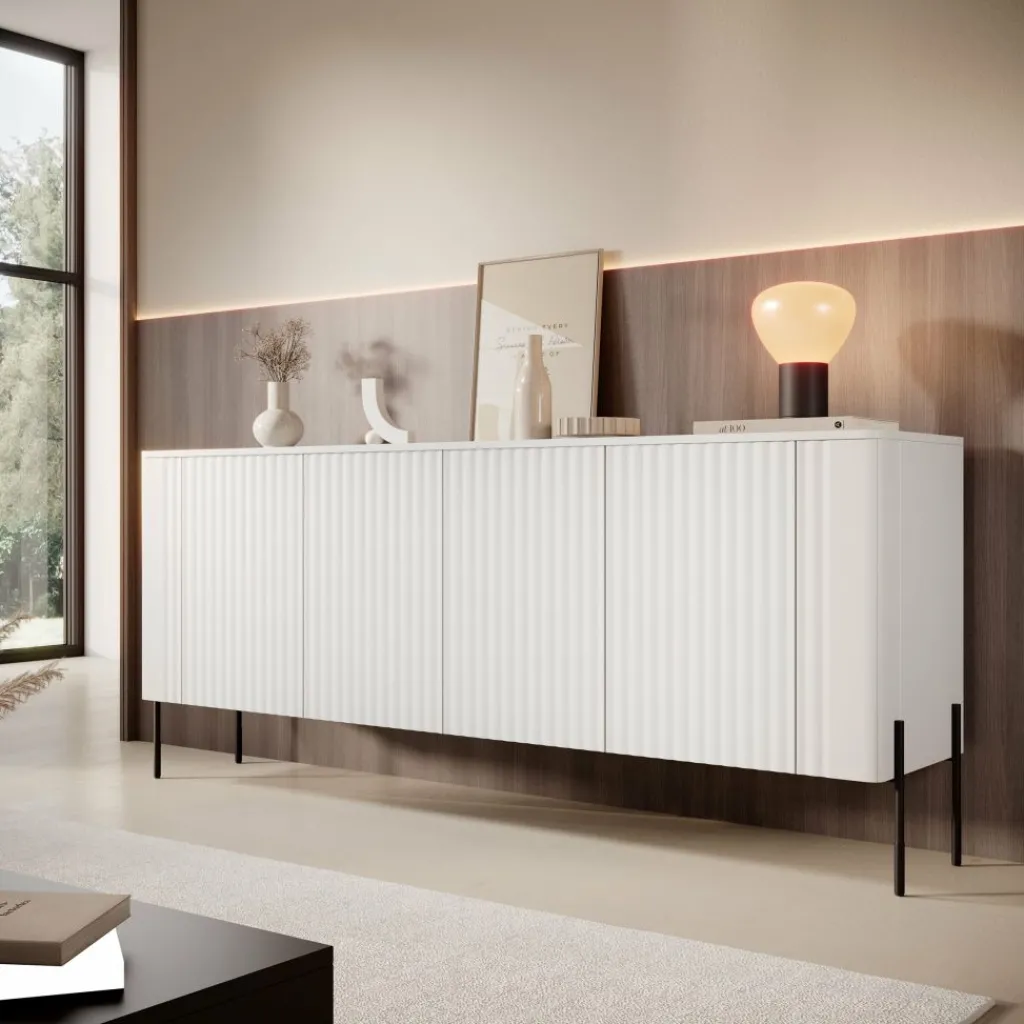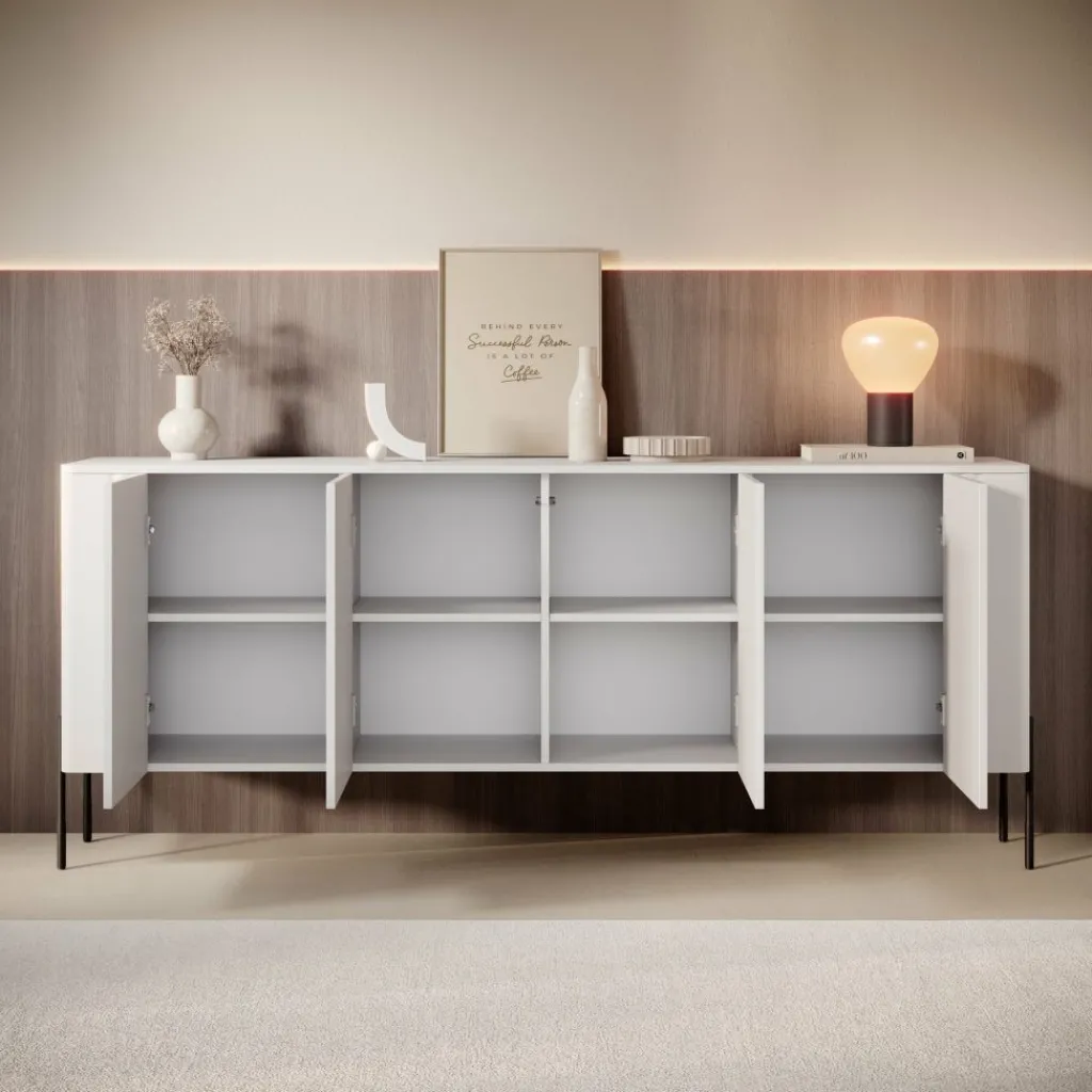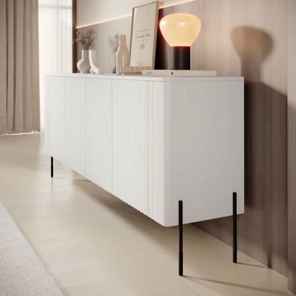 De hoge metalen poten geven het dressoir een lichte en elegante uitstraling. Door de frisse witte afwerking past dit meubel moeiteloos in uiteenlopende interieurstijlen — van modern en Scandinavisch tot minimalistisch. Een tijdloos meubel dat rust en balans brengt in elke woonruimte.