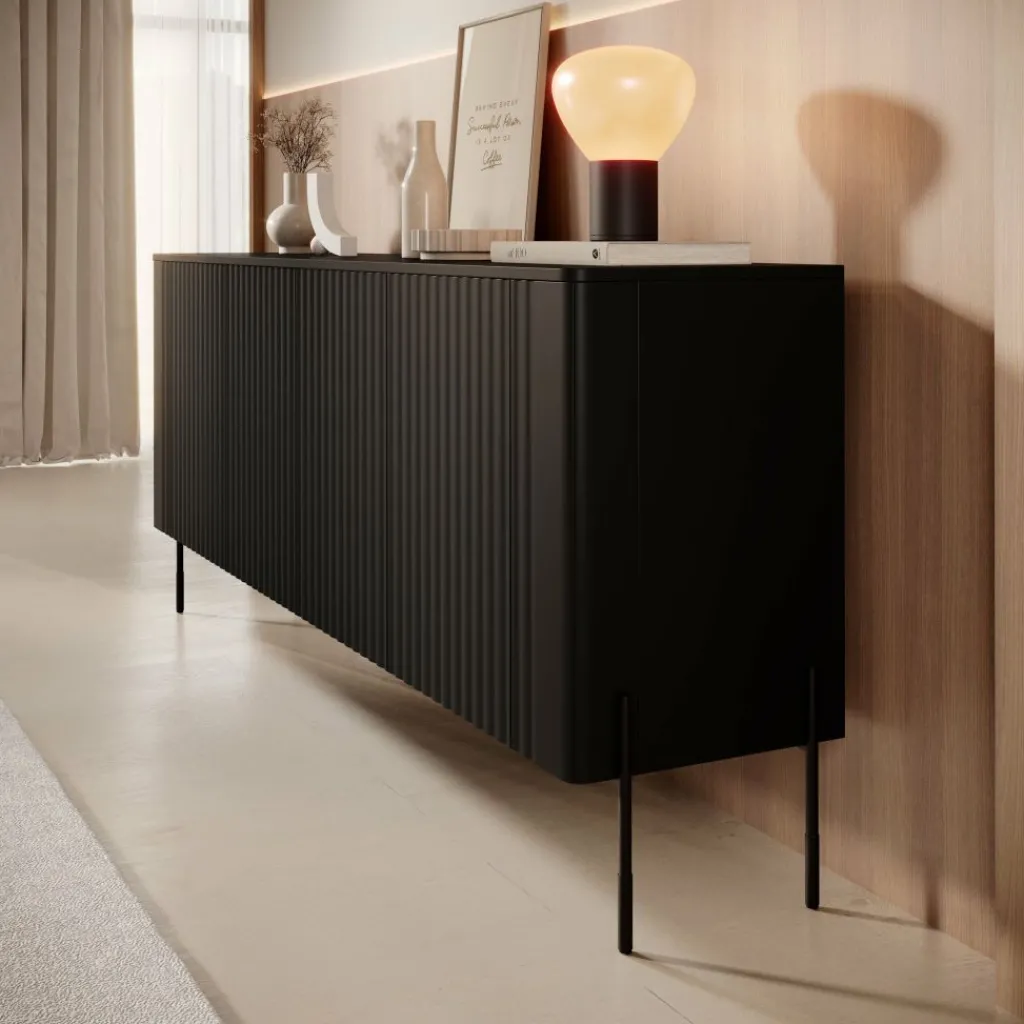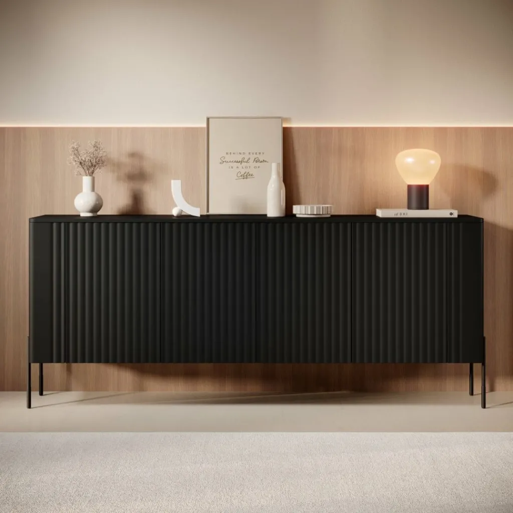 Het meubel staat op hoge, slanke poten van metaal die het ontwerp een luchtig karakter geven. De matzwarte kleur en strakke afwerking maken het dressoir geschikt voor moderne en minimalistische interieurs. Dankzij zijn lengte vormt het een elegante toevoeging aan de woonkamer of eetkamer.