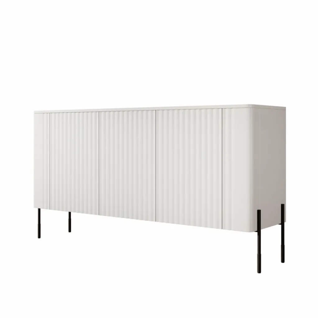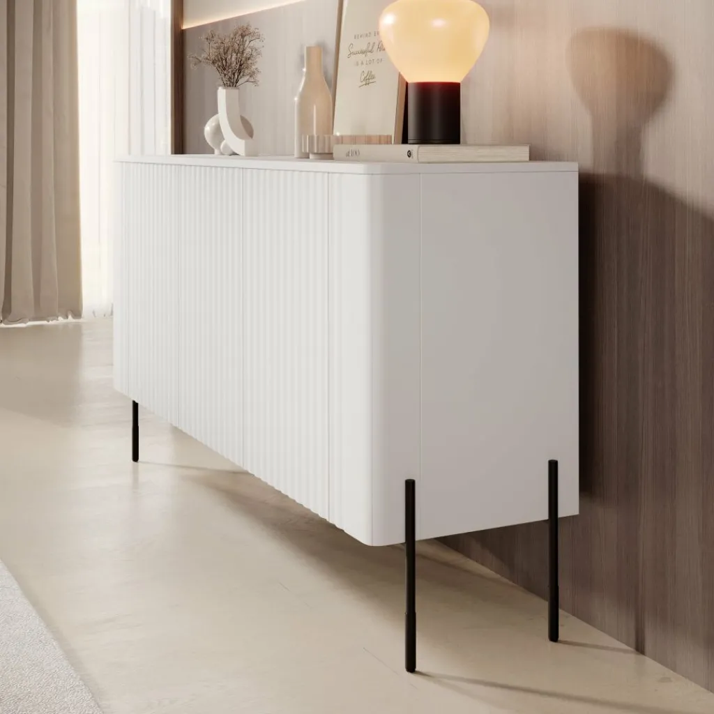Het dressoir staat op slanke metalen poten, wat zorgt voor stabiliteit en een luchtige vorm. De witte kleur maakt het eenvoudig te combineren met verschillende materialen en stijlen, van modern tot Scandinavisch.