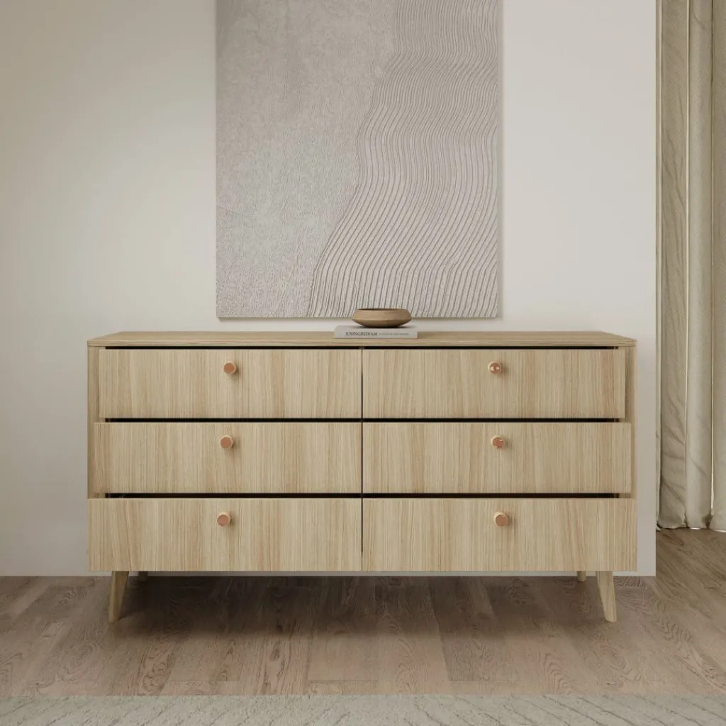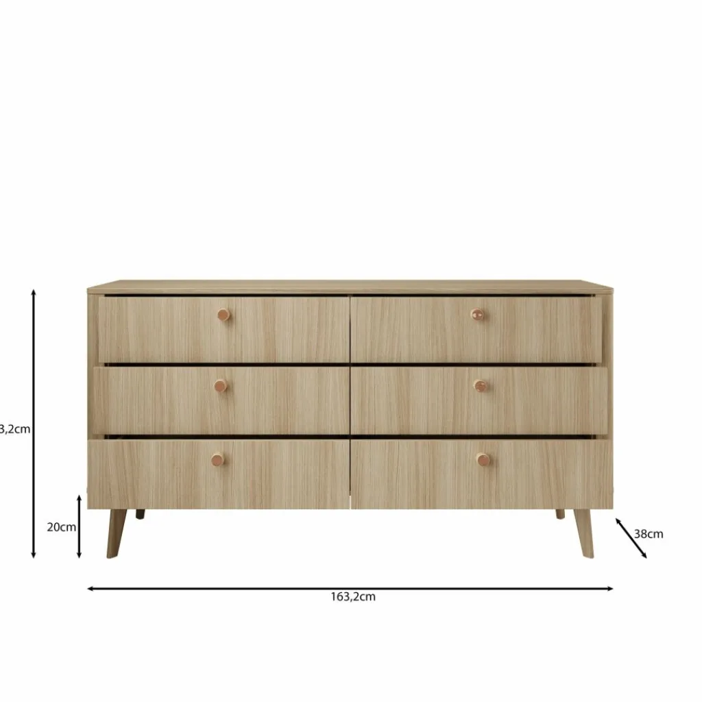De afgeronde hoeken en taps toelopende poten geven het meubel een verfijnde, Scandinavische uitstraling. De ladegrepen in een warme houttint vormen een subtiel accent dat past binnen een licht en tijdloos interieur. Met zijn heldere eikenkleur en functionele indeling combineer je eenvoudig stijl met gebruiksgemak.