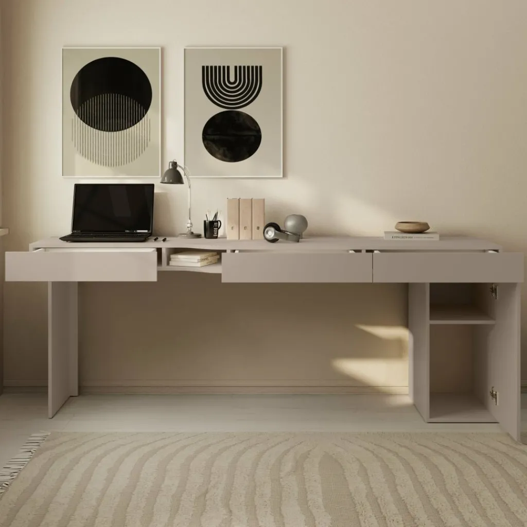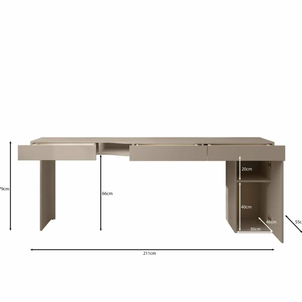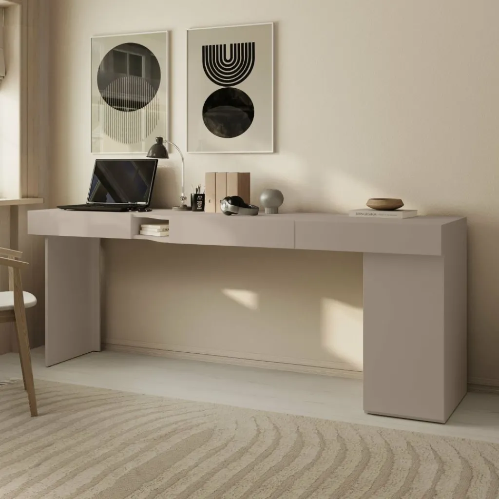 Met een breedte van 211 cm is er genoeg ruimte voor laptop, monitor, schrijfmaterialen en accessoires. De beige kleur en rustige vormgeving sluiten goed aan bij uiteenlopende interieurstijlen, van minimalistisch tot Scandinavisch.