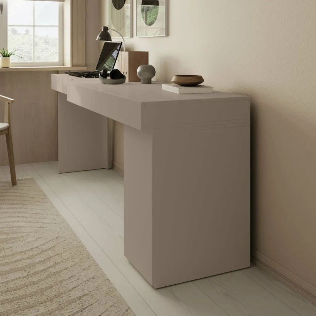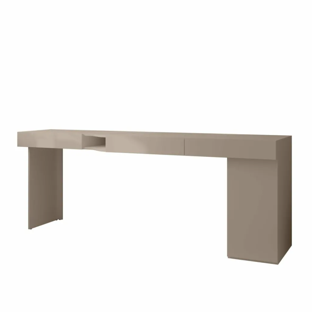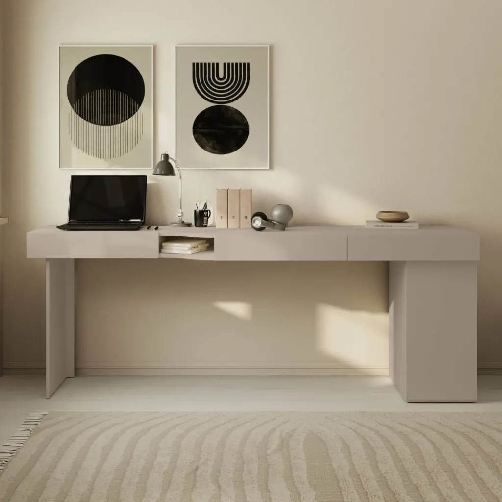 Met een breedte van 211 cm is er genoeg ruimte voor laptop, monitor, schrijfmaterialen en accessoires. De beige kleur en rustige vormgeving sluiten goed aan bij uiteenlopende interieurstijlen, van minimalistisch tot Scandinavisch.