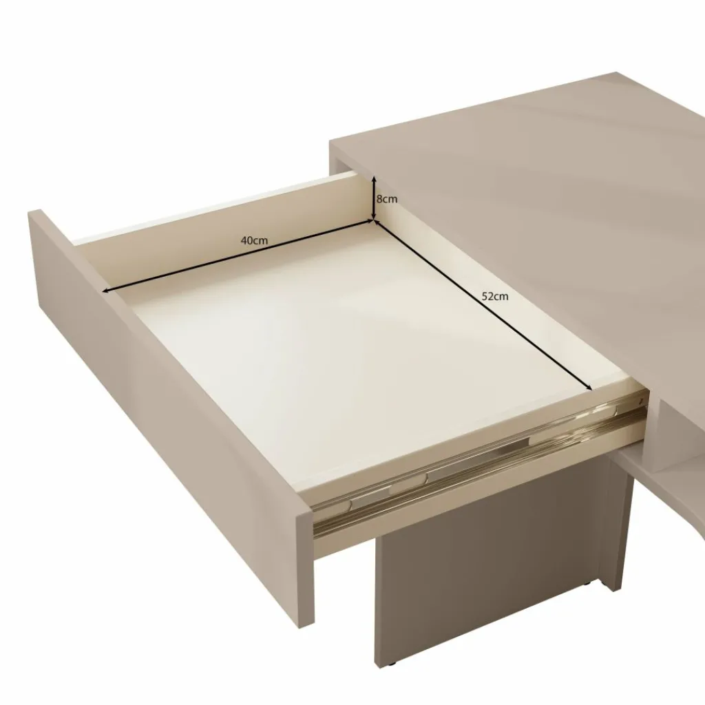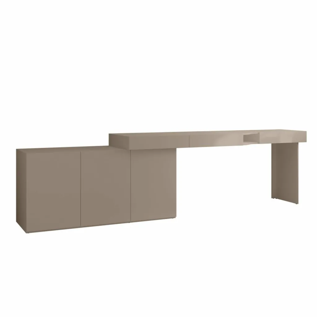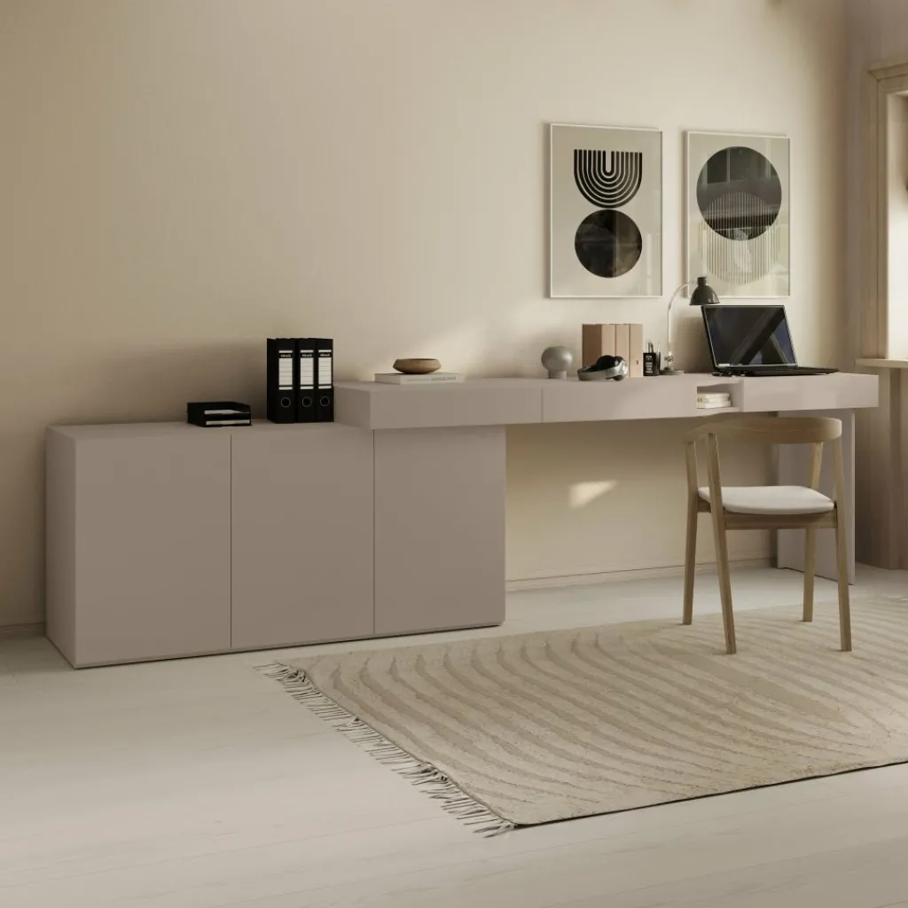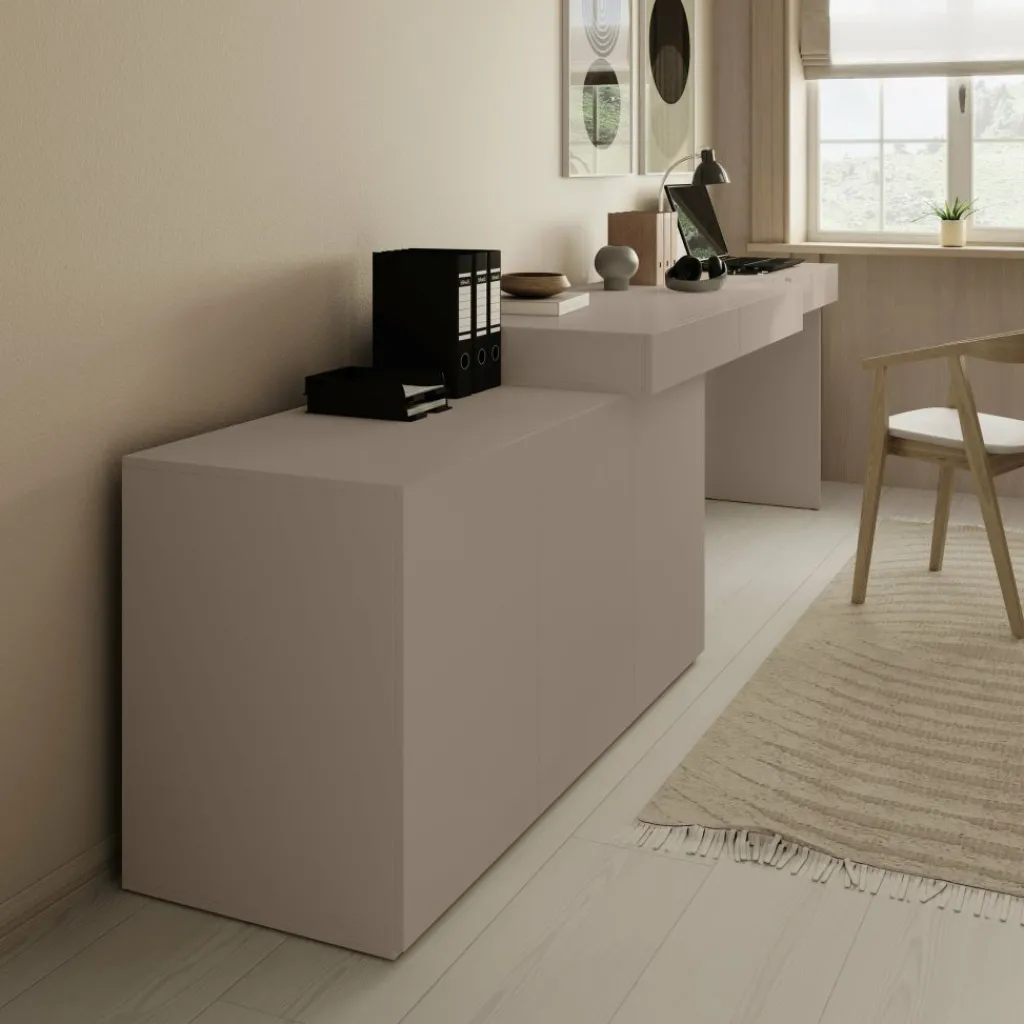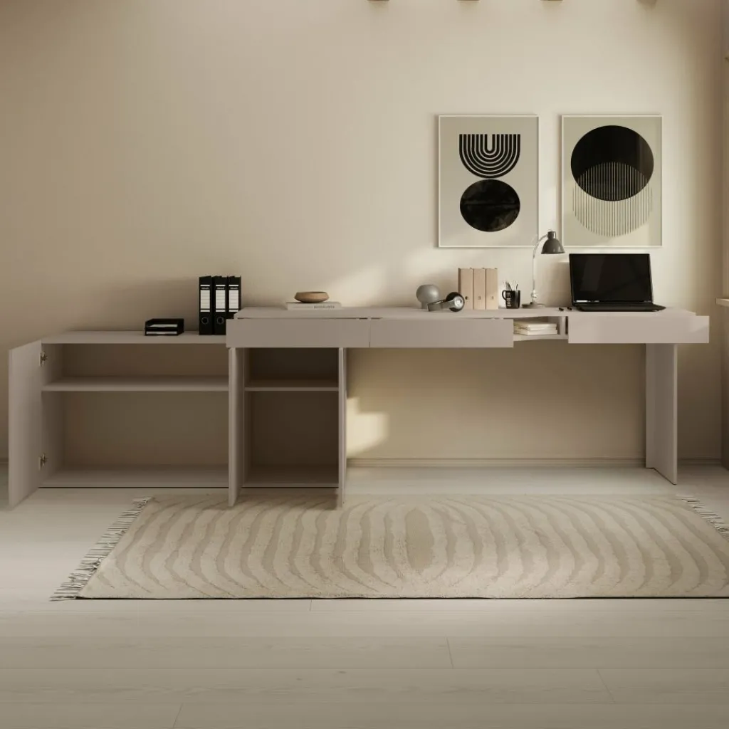 Het Whenua bureau heeft een ruim werkblad met ondersteuning aan de rechterkant. Voorzien van drie lades voor praktische opbergruimte, één deur met daarachter twee vakken en een open vak tussen de lades. De beige uitvoering is neutraal en eenvoudig te combineren met andere meubels. Geschikt voor thuiswerken en studie.