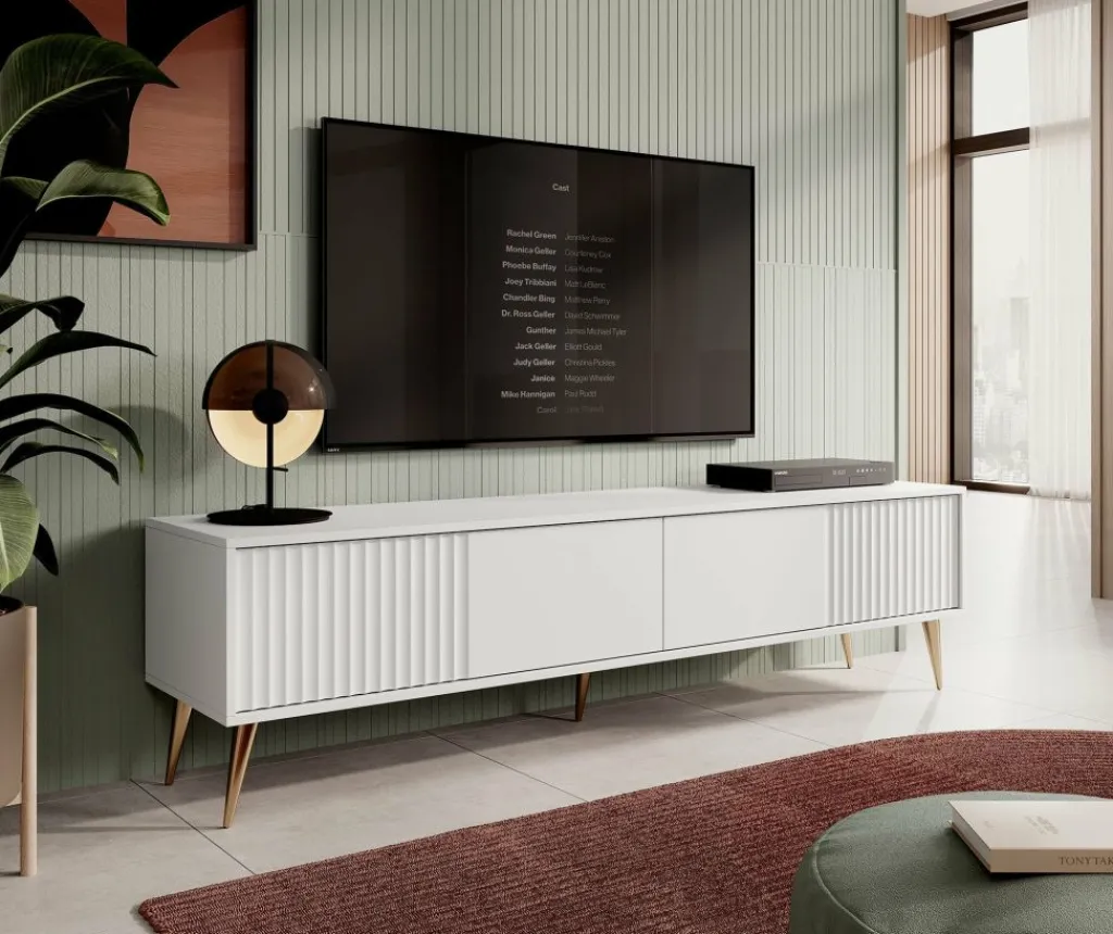 De kleppen zijn greeploos en hebben een latten patroon aan de voorzijde. Het tv-meubel staat op hoge, goudkleurige pootjes.