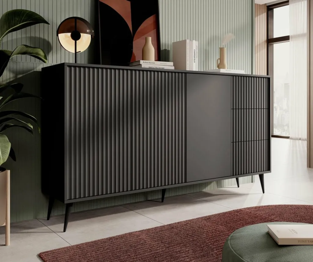 De kast heeft 3 deuren met daarachter vier opbergvakken. Daarnaast zitten 3 lades. De deuren en lades zijn greeploos.De voorkant van de deuren hebben een latten patroon.