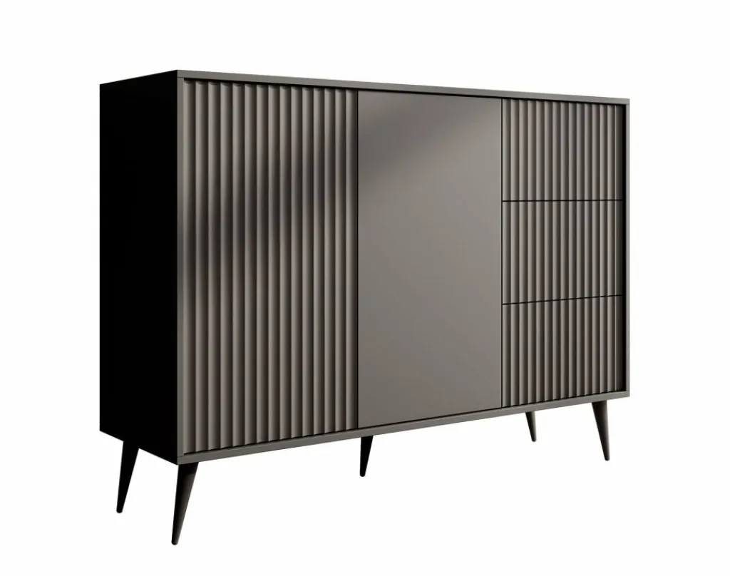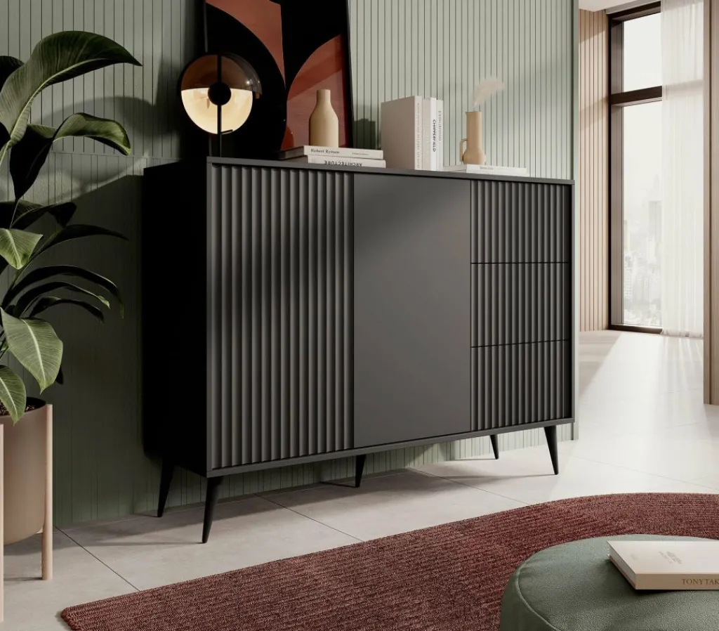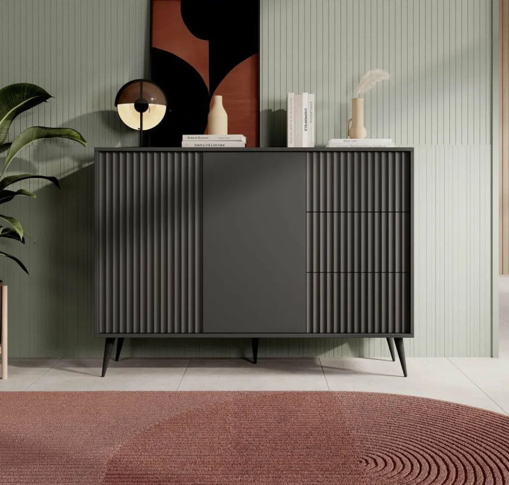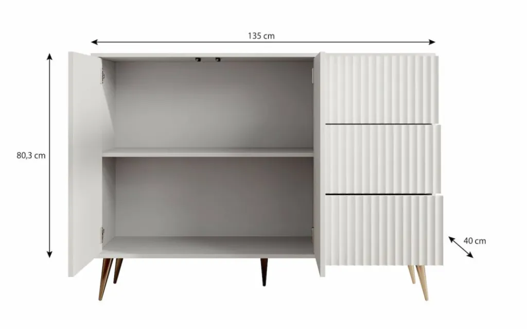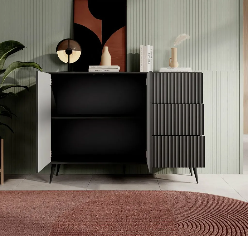 De kast heeft 2 deuren met daarachter twee opbergvakken. Daarnaast zitten 3 lades. De deuren en lades zijn greeploos.De voorkant van de deuren hebben een latten patroon.