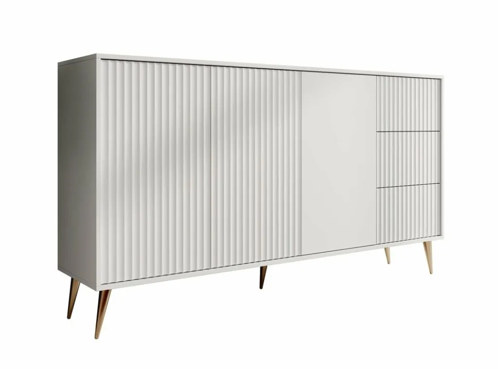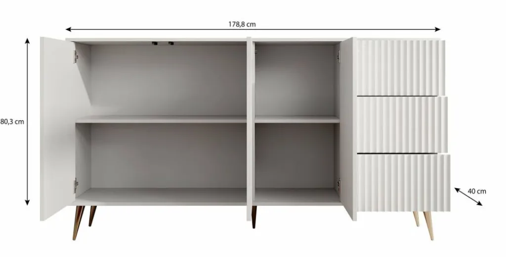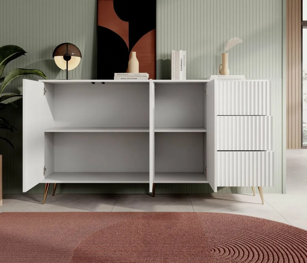 De kast heeft 3 deuren met daarachter vier opbergvakken. Daarnaast zitten 3 lades. De deuren en lades zijn greeploos.De voorkant van de deuren hebben een latten patroon.