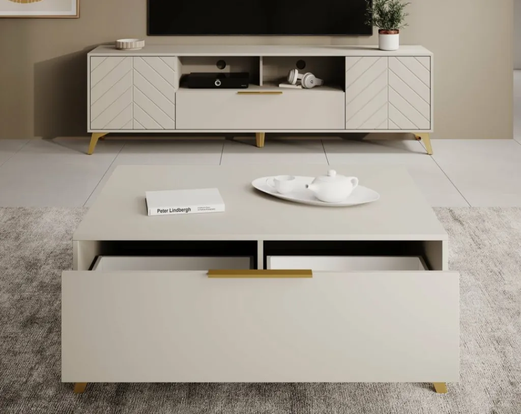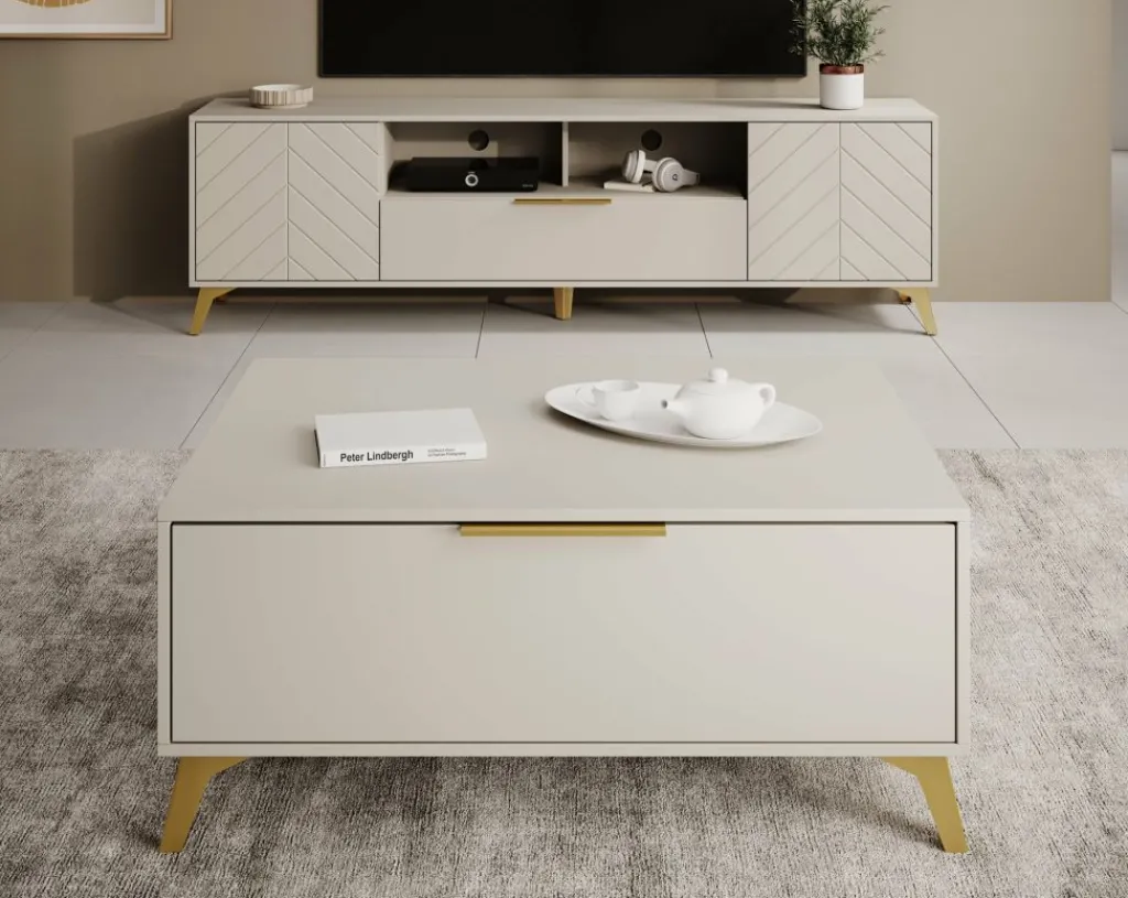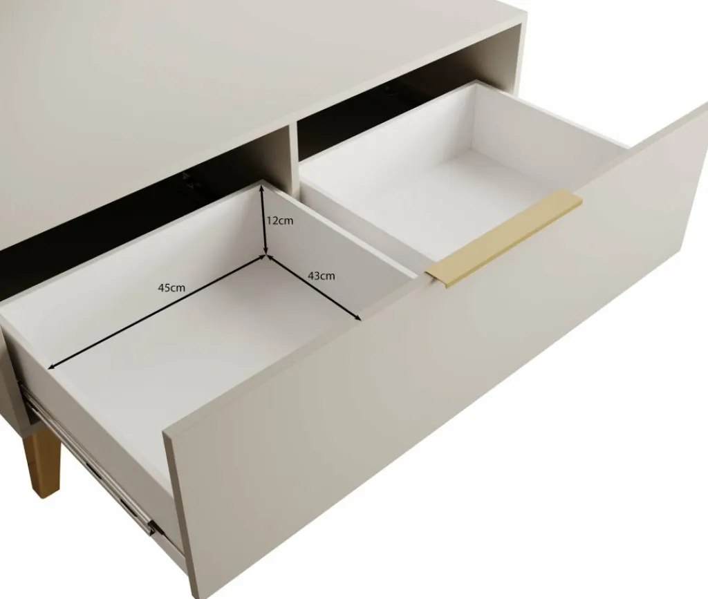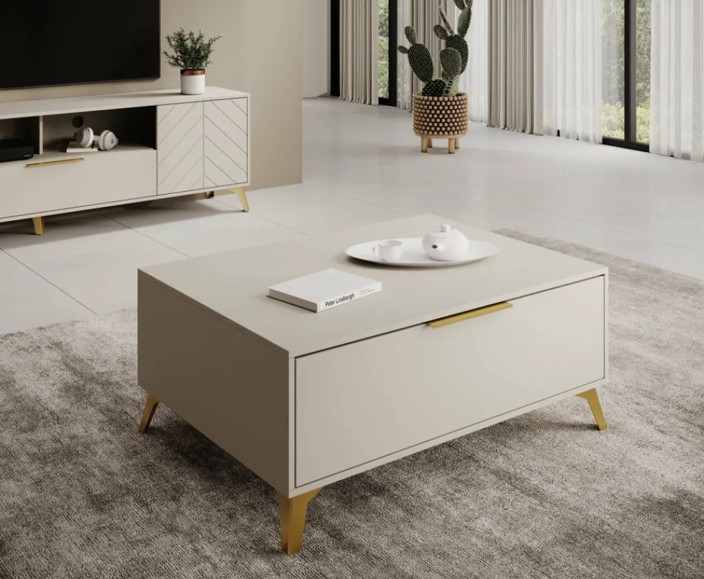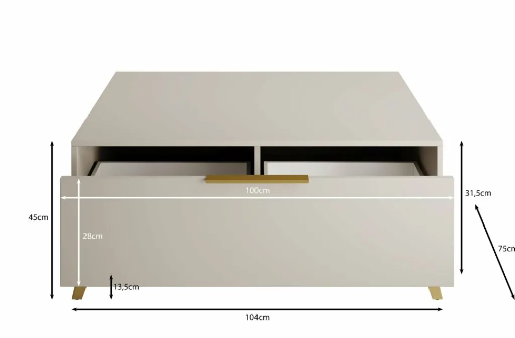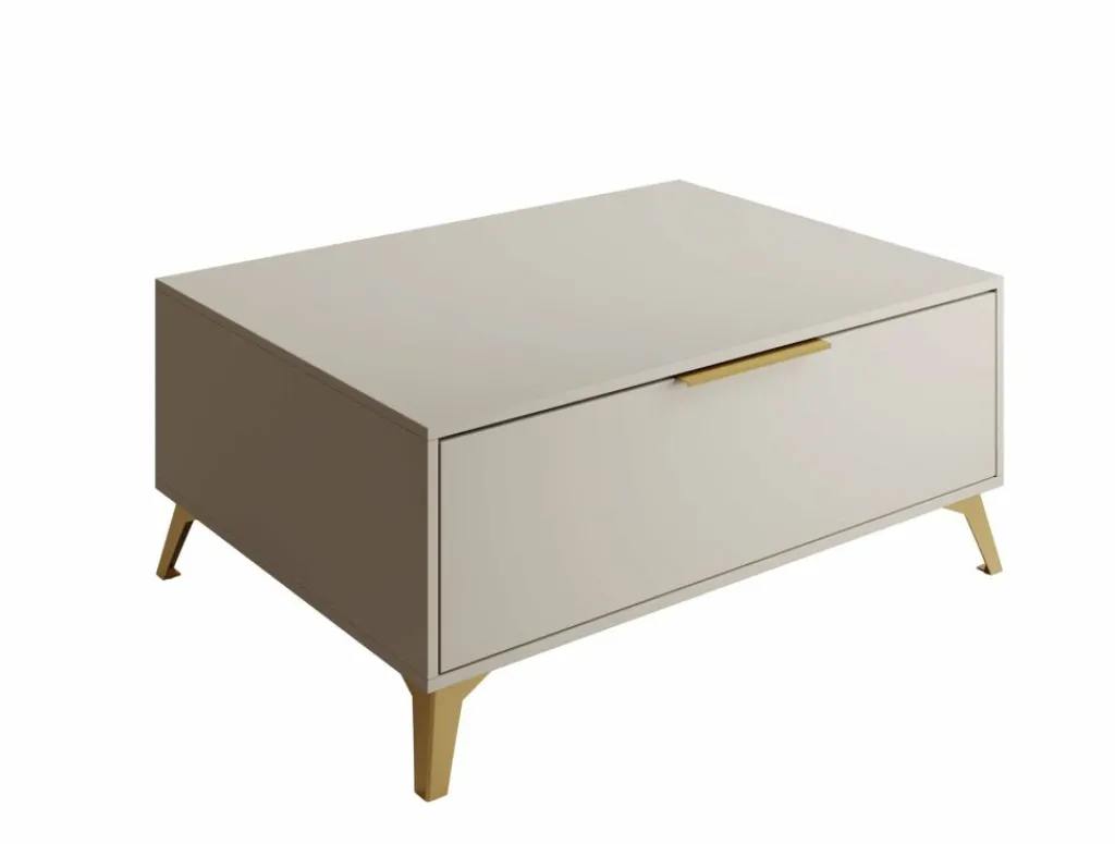 Salontafel Xiano is een rechthoekige tafel met een moderne uitstraling. De salontafel beschikt over 1 brede lade welke 2 vakken heeft. Deze lade opent met een goudkleurige handgreep. De Xiano is uitgevoerd in een beige kleur met goudkleurige poten. Deze poten zijn gemaakt van metaal.