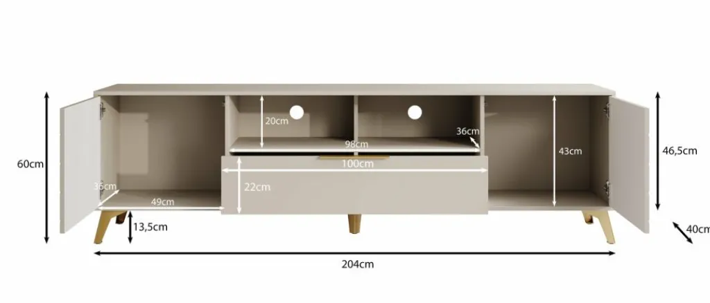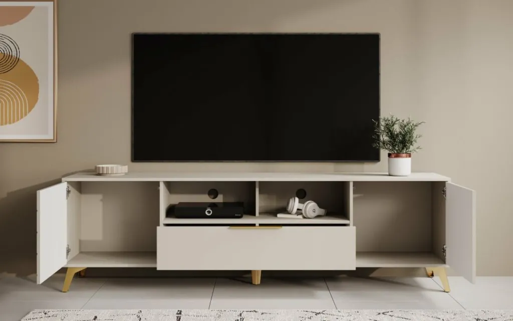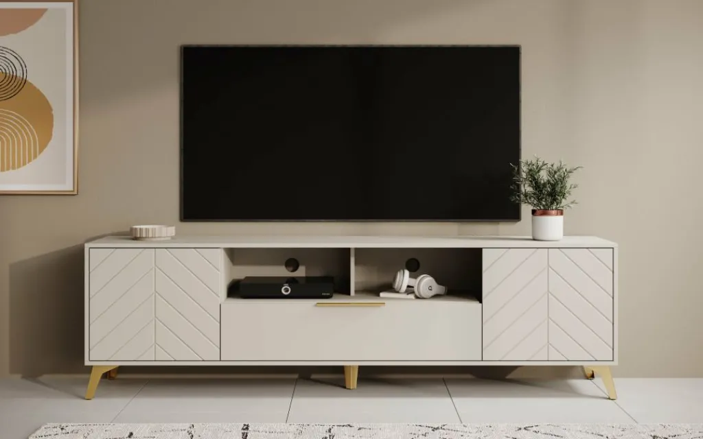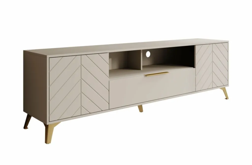TV-Meubel Xiano is een moderne tv-kast uitgevoerd in beige. De poten zijn gemaakt van metaal in de kleur goud. Het meubel beschikt over 2 deuren en 1 lade. De deuren hebben op de voorkant een visgraat patroon en openen met het push to open systeem. De lade opent met een goudkleurige handgreep en heeft 2 vakken. Boven de lade zijn nog 2 open vakken te vinden. In de achterwand zitten 2 uitsparingen om eventuele bedrading te kunnen wegwerken.