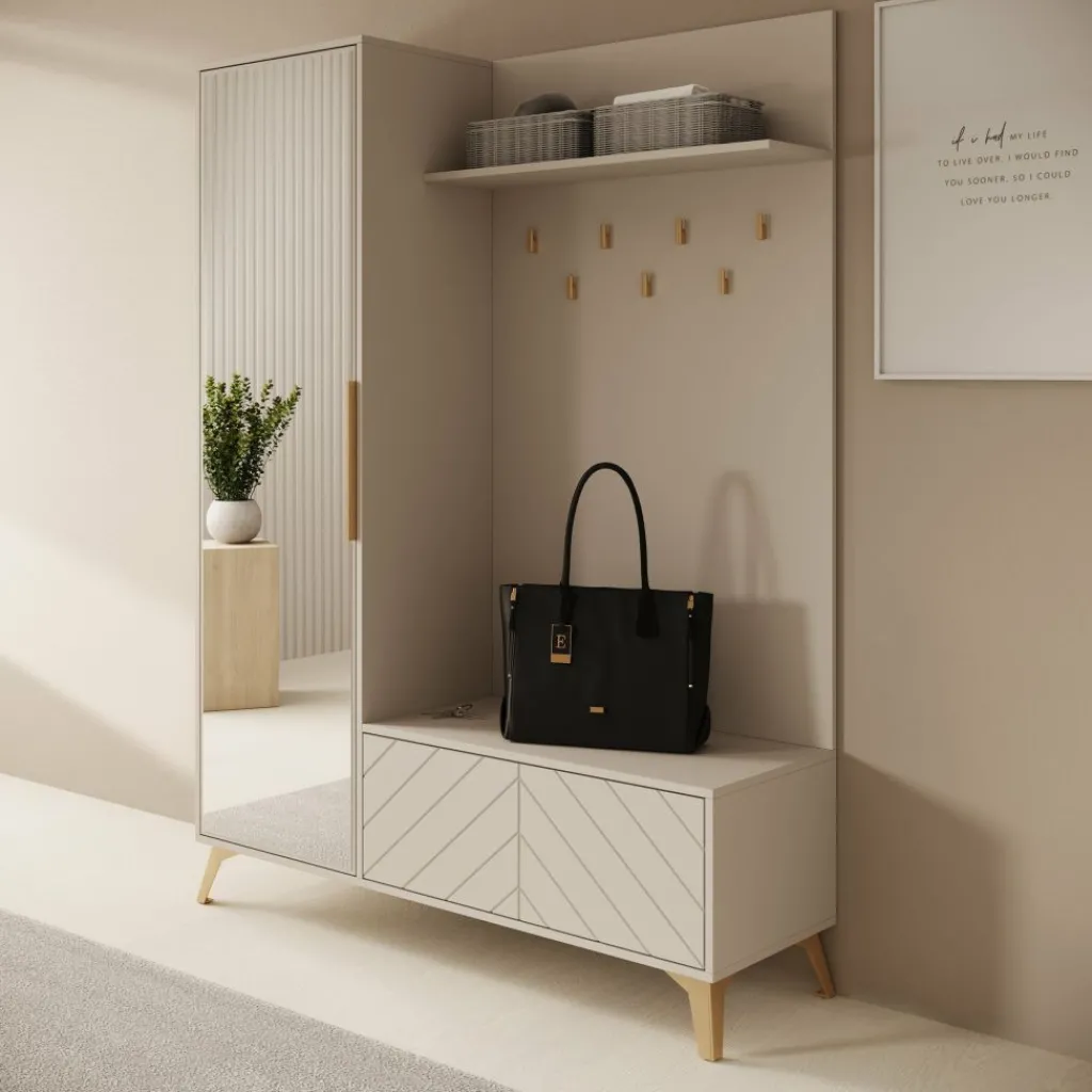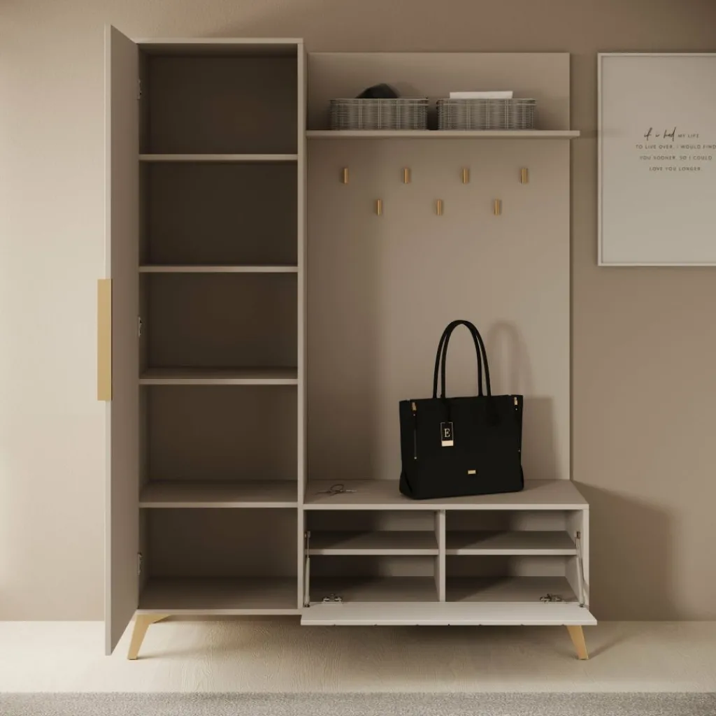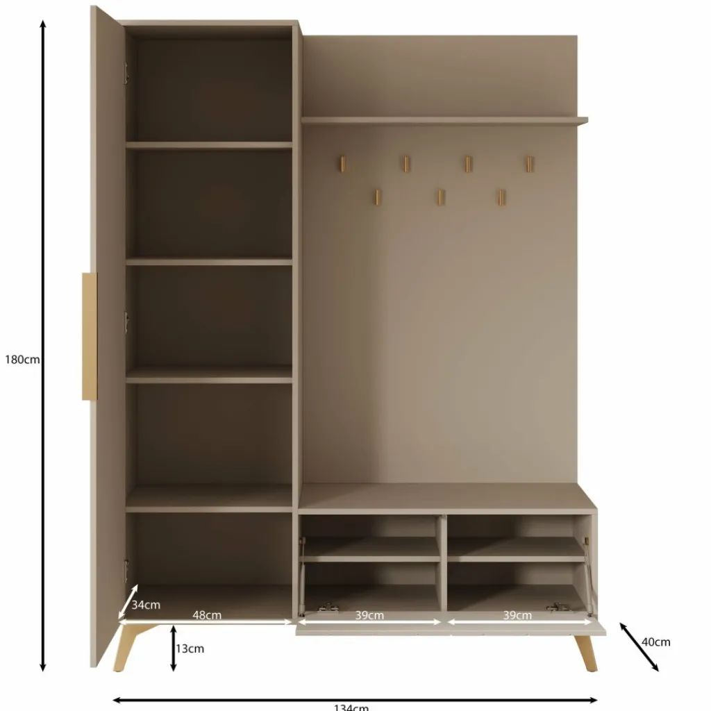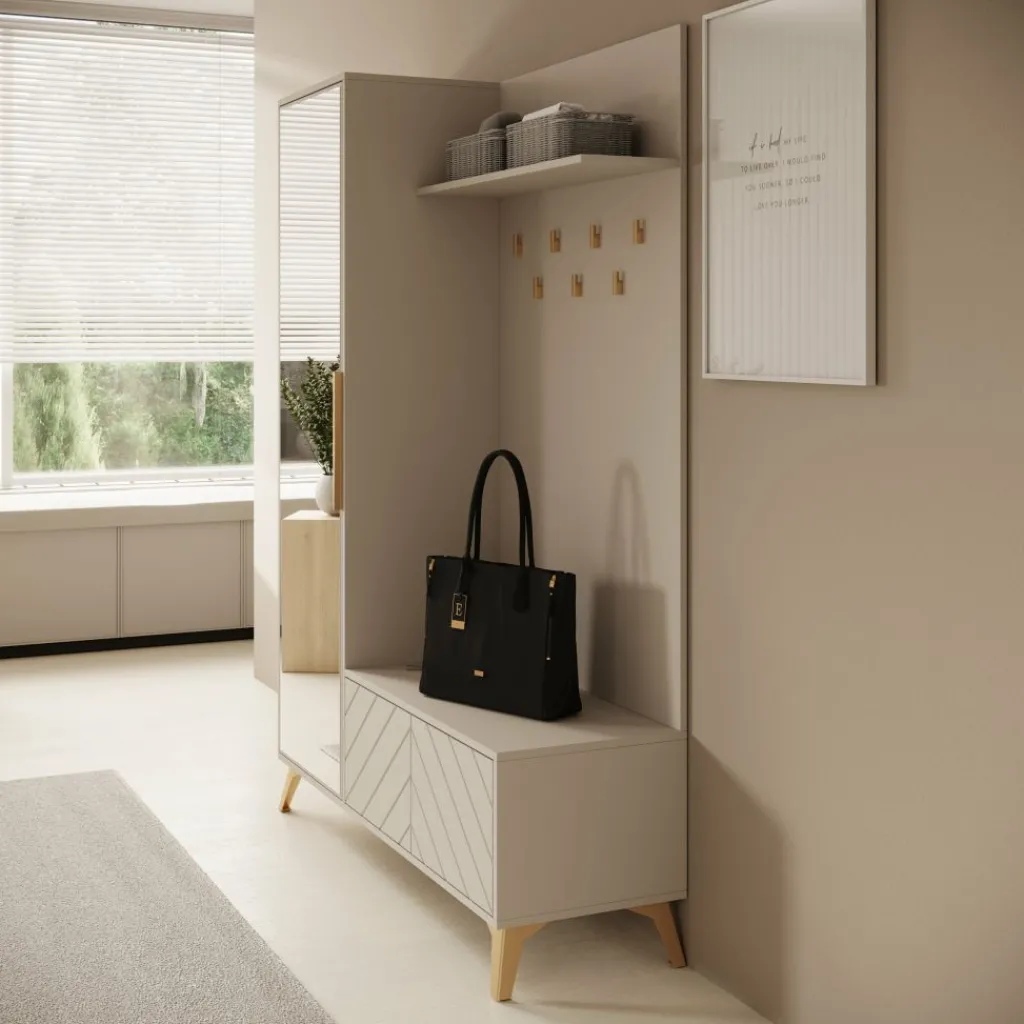 De deur aan de linkerkant zorgt ervoor dat spullen netjes uit het zicht blijven wanneer dat gewenst is. De halkast staat op schuine poten, wat zorgt voor een stabiele plaatsing en extra ruimte onder het meubel. De beige afwerking maakt de kast eenvoudig te combineren met verschillende interieurstijlen.