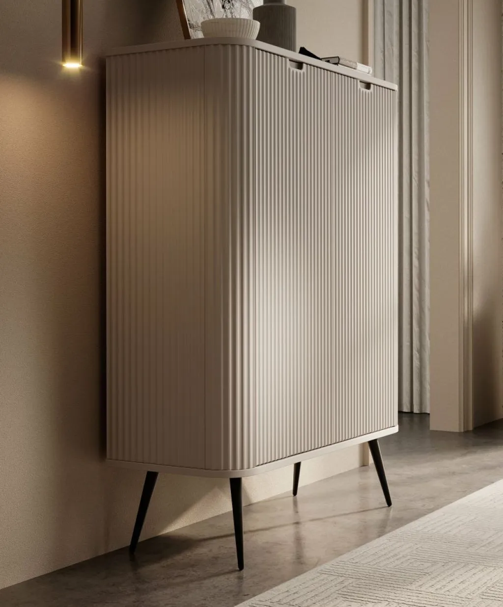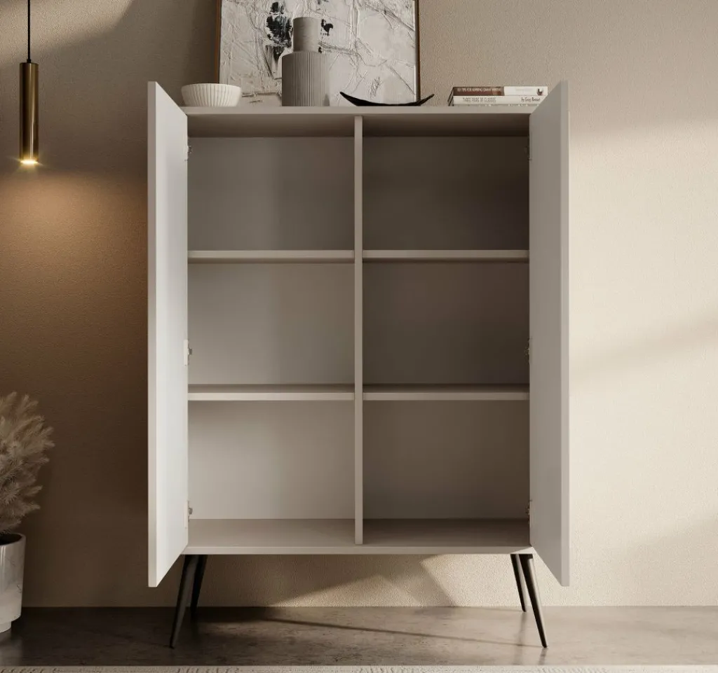 Dressoir Zakari is een moderne designkast, uitgevoerd in een beige kleur. De kast beschikt over twee deuren met daarachter 6 opbergvakken. De deuren openen door middel van inkepingen aan de bovenkant. De kast staat op hoge zwarte pootjes, gemaakt van metaal. Door het strakke en eenvoudige design is dit meubel vooral passend binnen een industriële en hotelchique woonstijl.