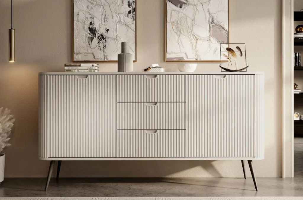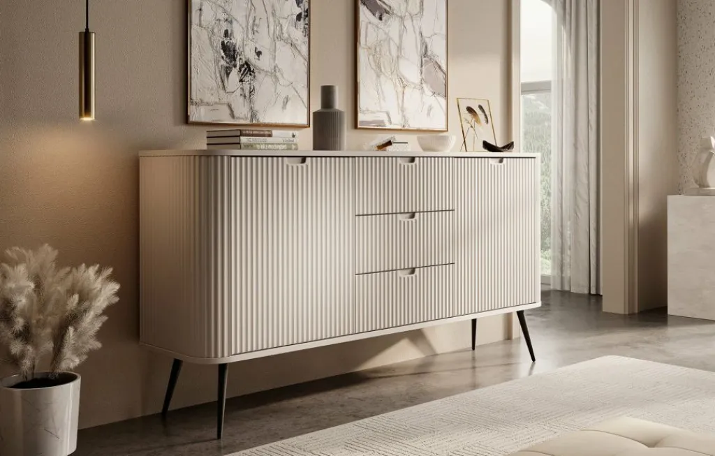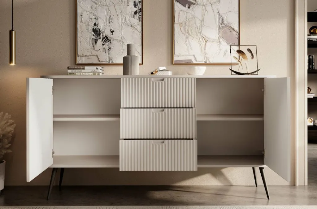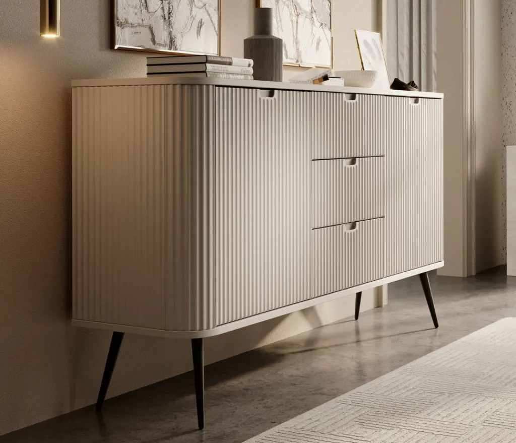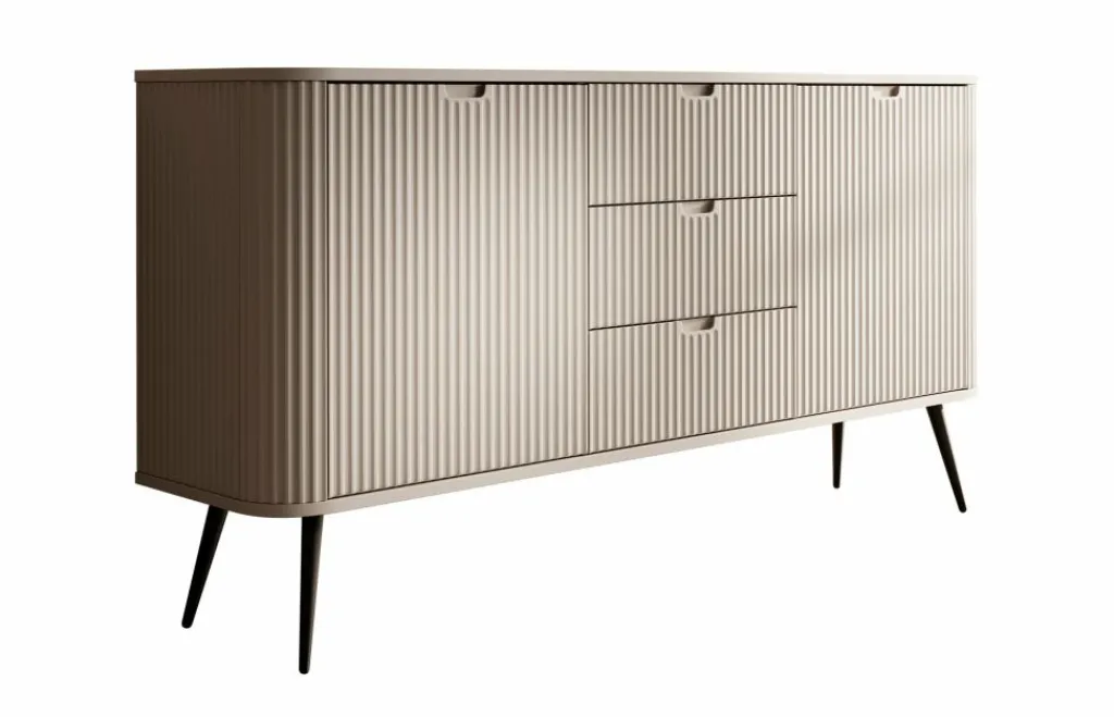Dressoir Zakari is een moderne designkast, uitgevoerd in een beige kleur. De kast beschikt over 3 lades en 2 deuren met daarachter 4 opbergvakken. De deuren en lades openen door middel van inkepingen aan de bovenkant. De kast staat op hoge zwarte pootjes, gemaakt van metaal. Door het strakke en eenvoudige design is dit meubel vooral passend binnen een industriële en hotelchique woonstijl.
