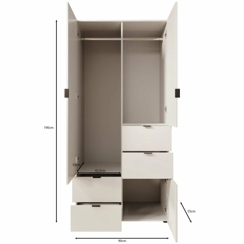 Met afmetingen van 90x55x190 cm combineert de Zayden kast compact formaat met verrassend veel opbergruimte, ideaal voor zowel grote als kleinere slaapkamers.